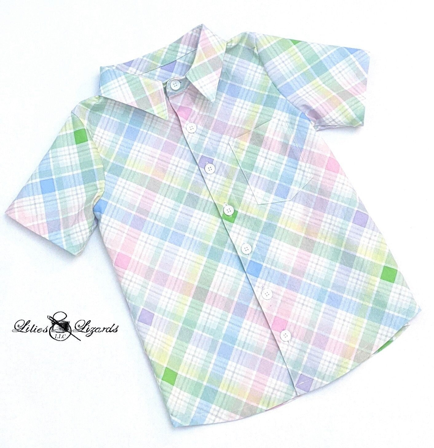 This handsome short-sleeve button-up shirt features a soft, colorful plaid pattern, making it the perfect choice for Easter, spring portraits, summer outings, or everyday wear!