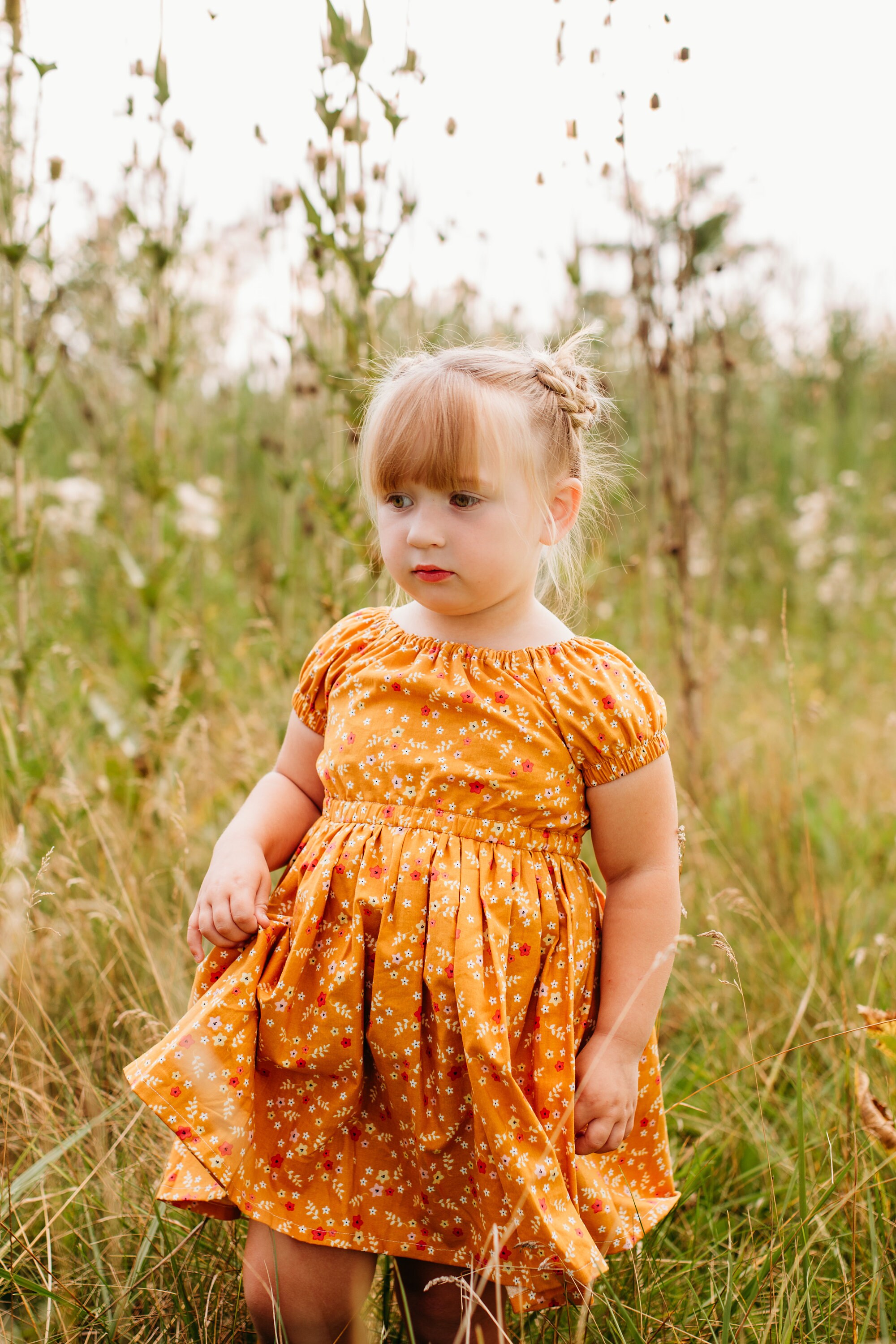 Your little one will shine in this sweet, handmade dress, designed for both comfort and charm. Made from a beautiful 100% cotton fabric in a warm mustard yellow with a dainty floral print, this dress is perfect for everyday wear, special occasions, or seasonal photos.