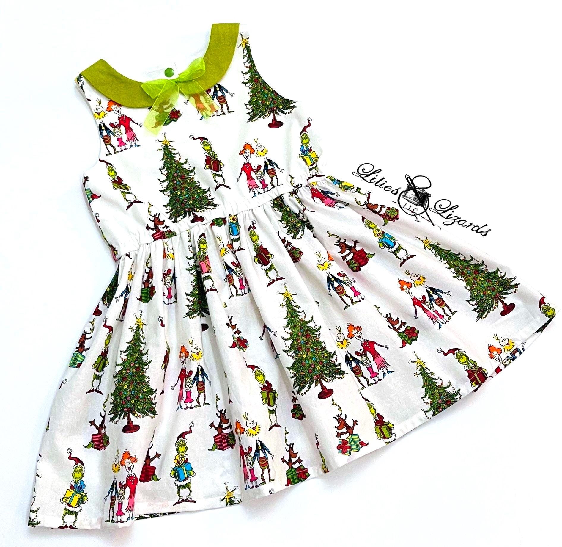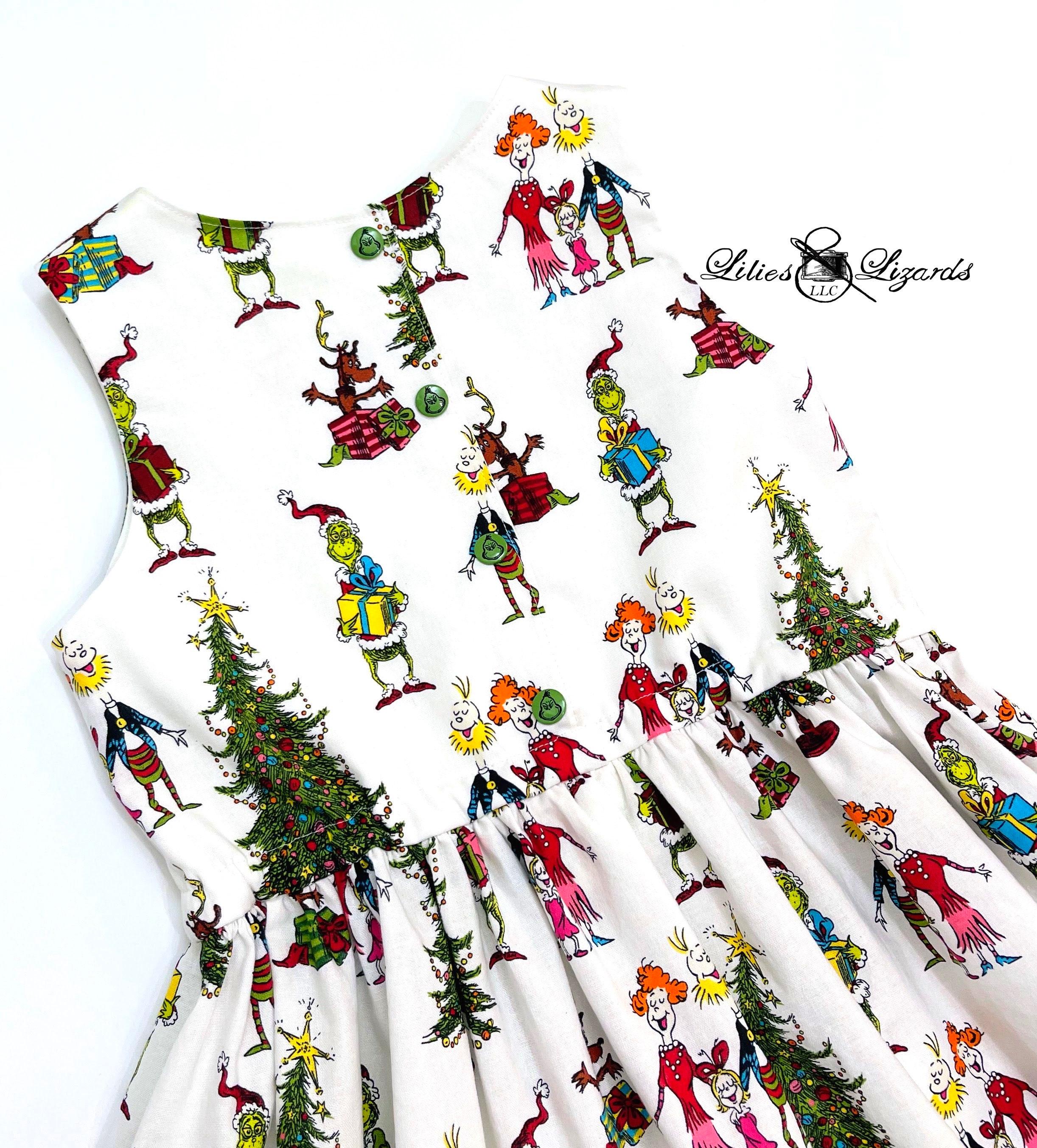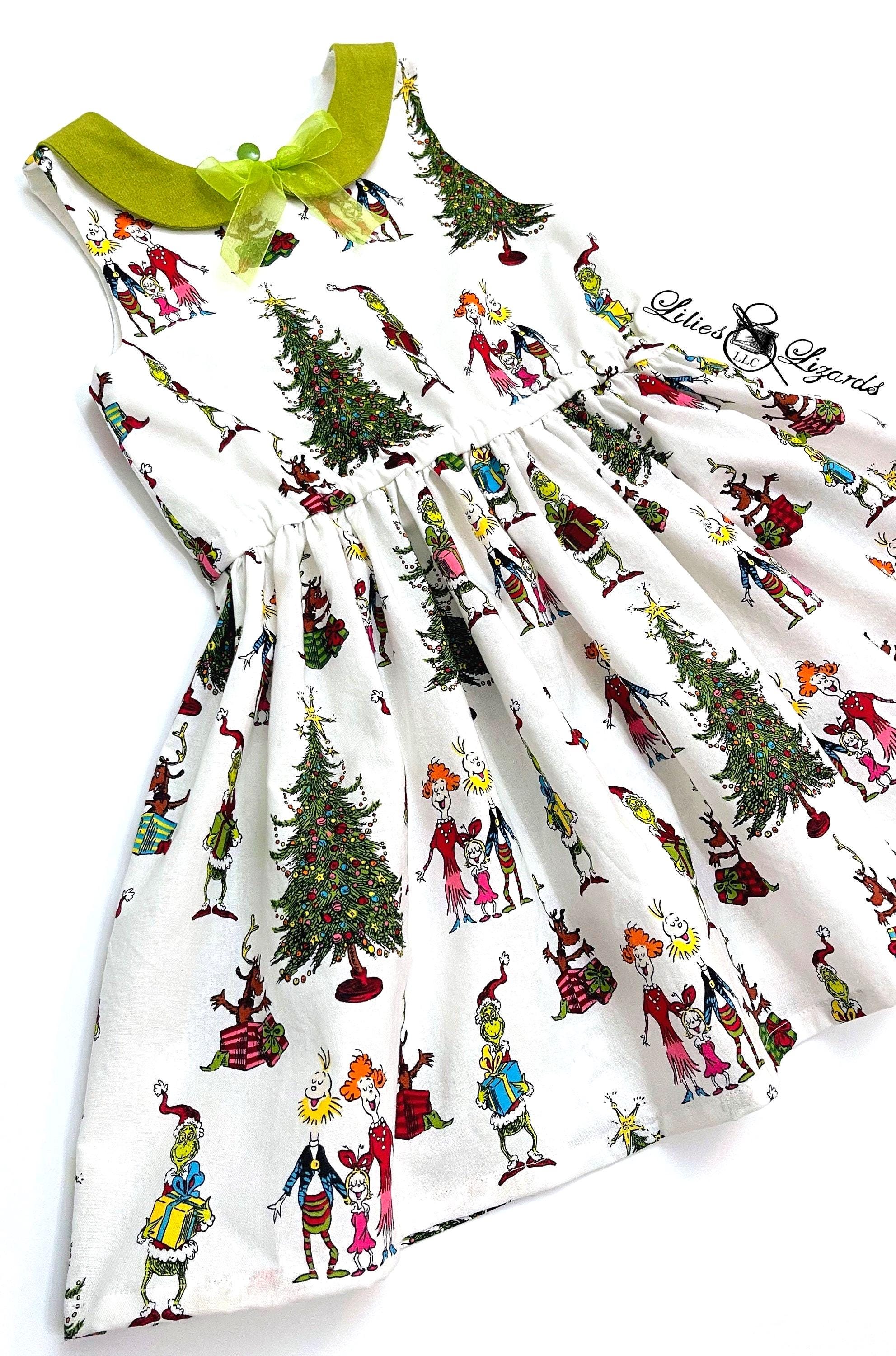 Made from 100% cotton fabric, this sleeveless dress offers both comfort and style. The charming collar adds a sweet touch, while the fabric showcases fun, colorful scenes from the classic Christmas movie. Your little girl will love dressing up in this whimsical and festive piece that captures the spirit of holiday cheer!