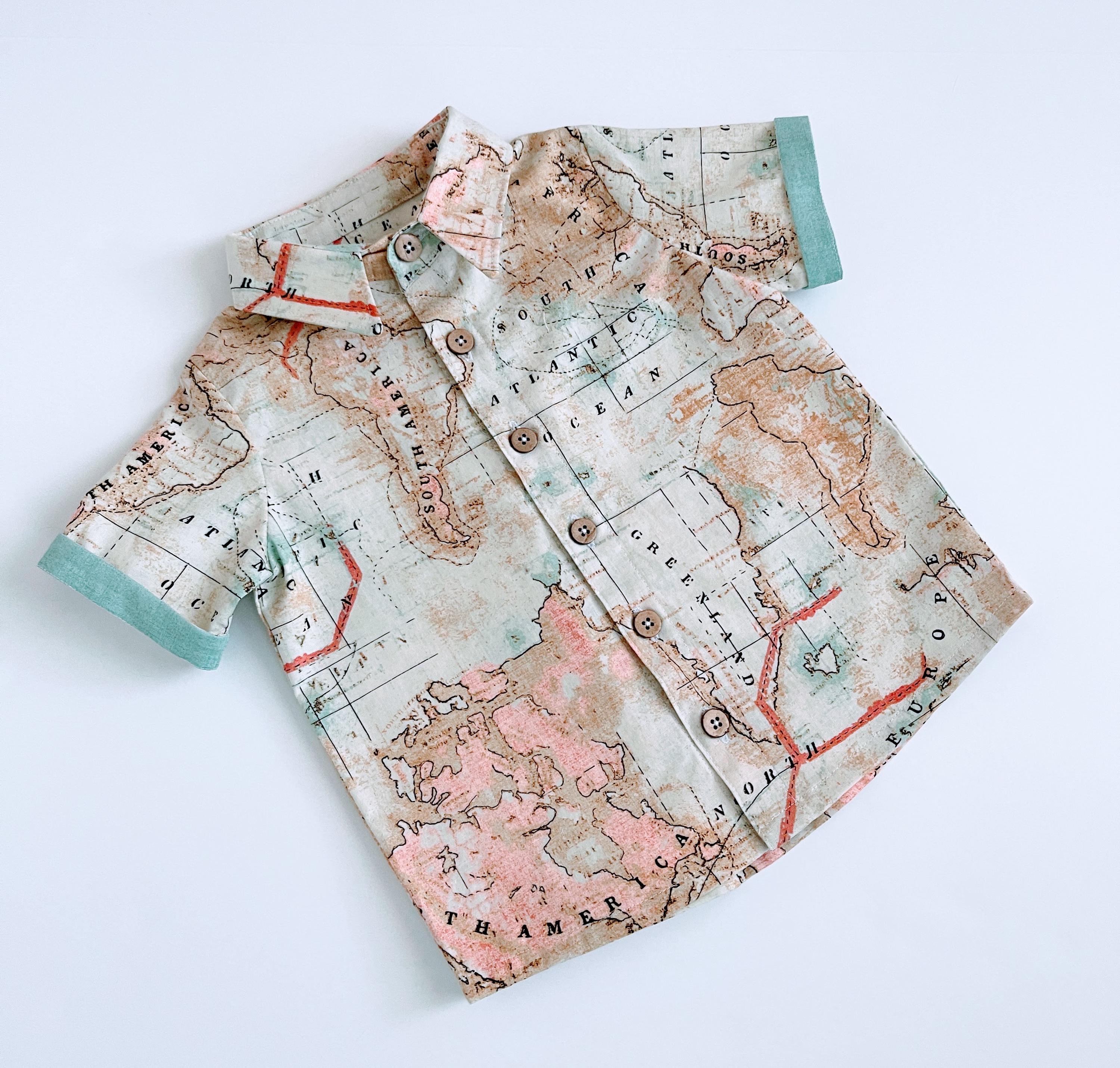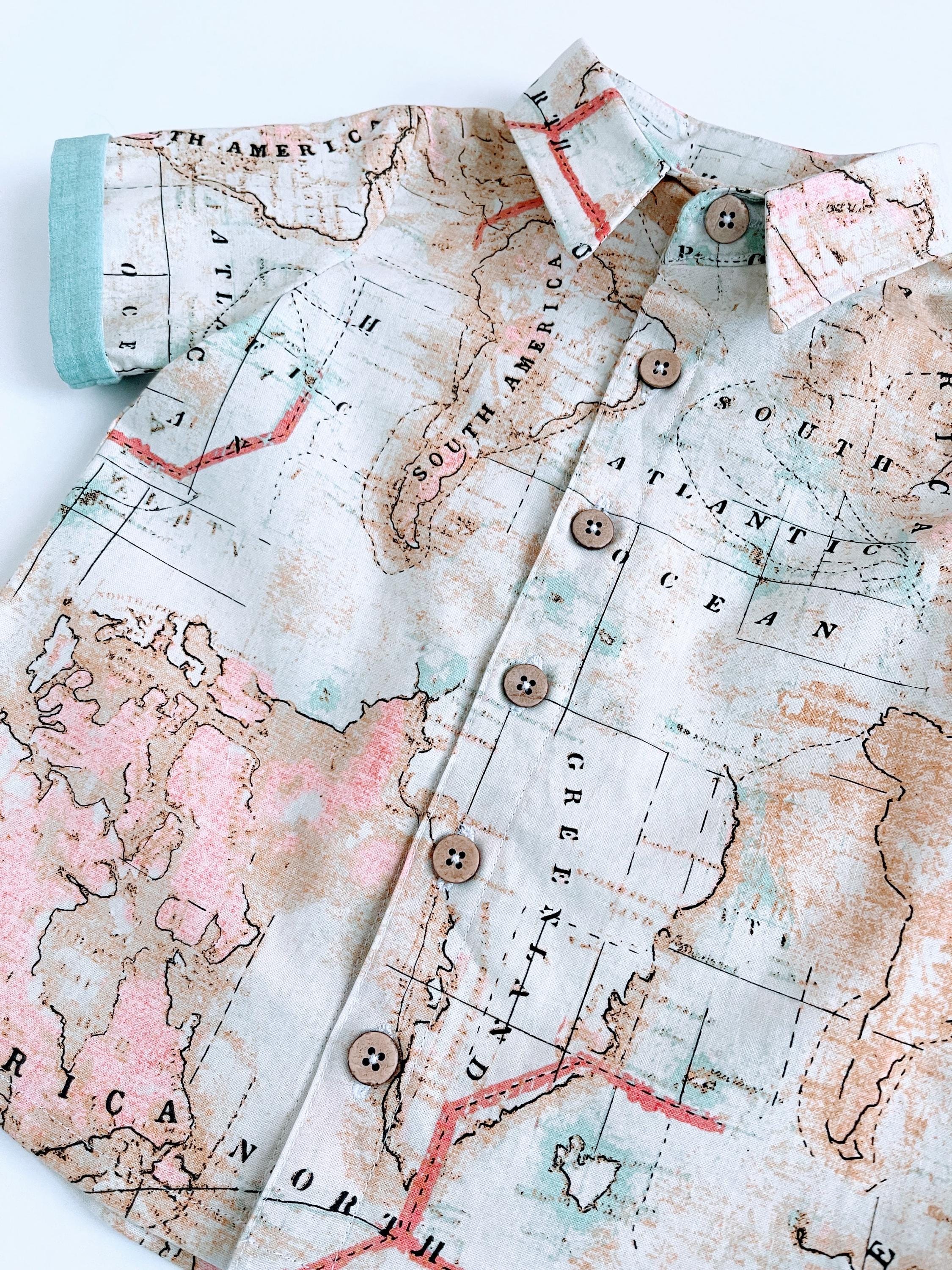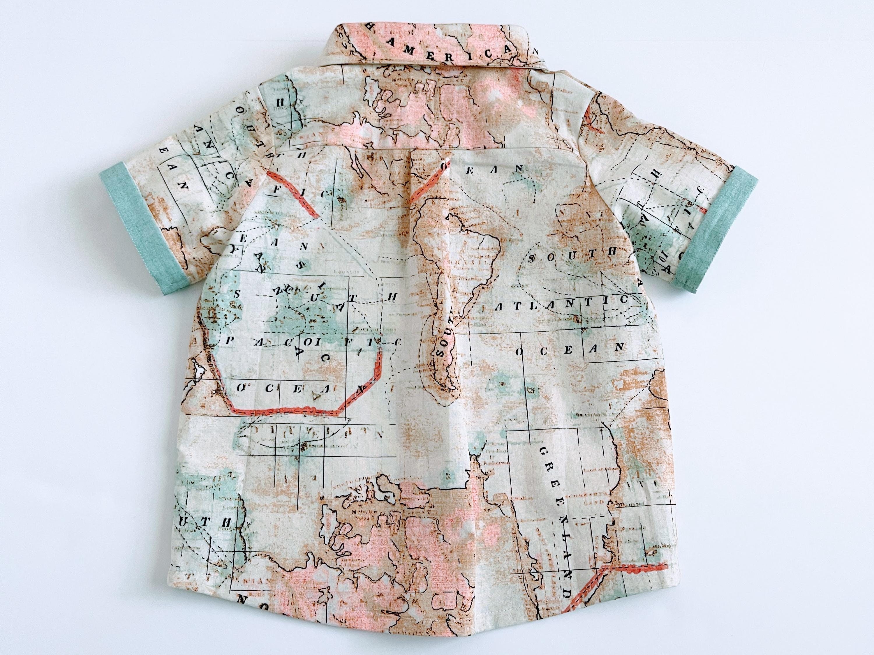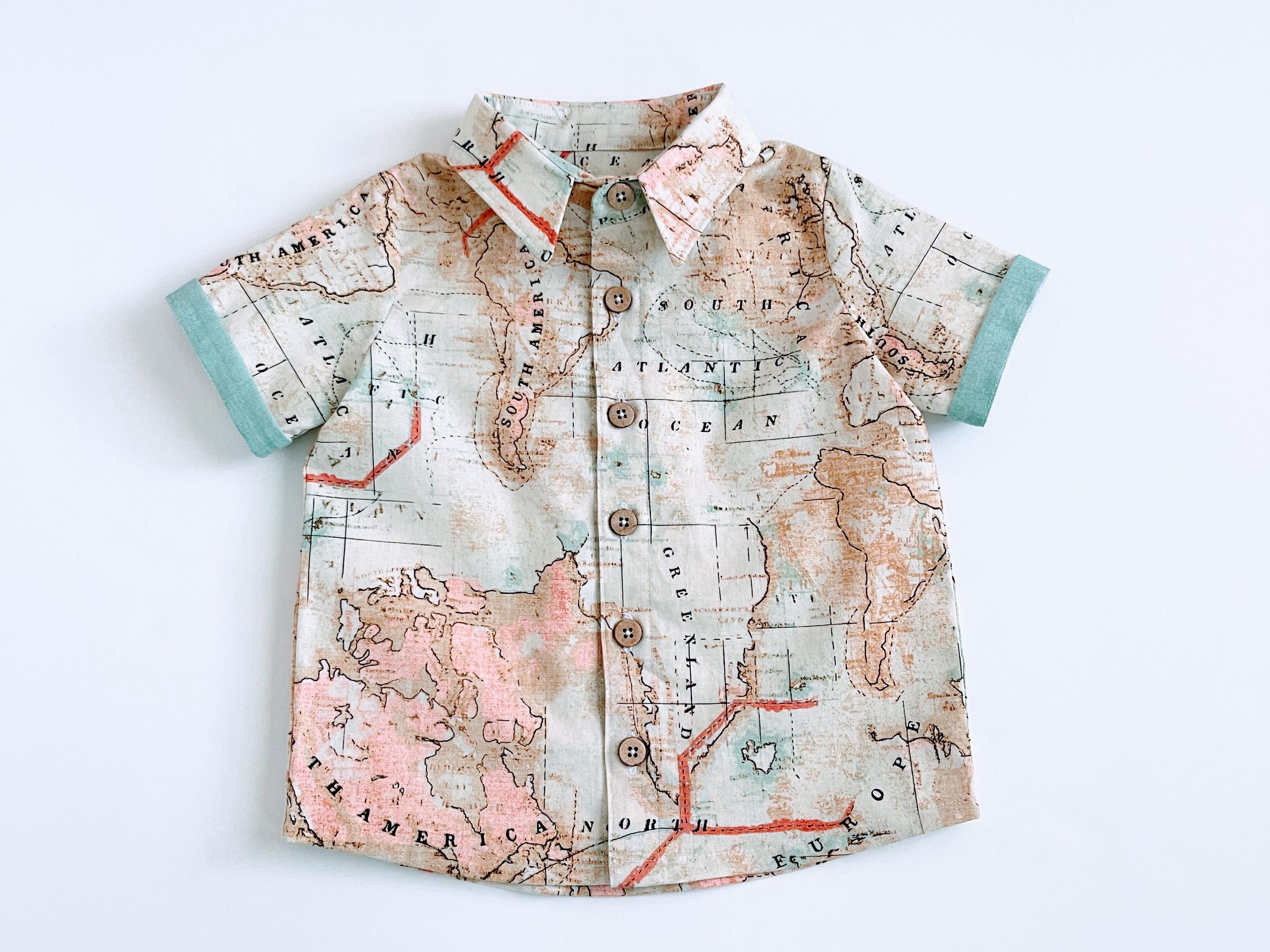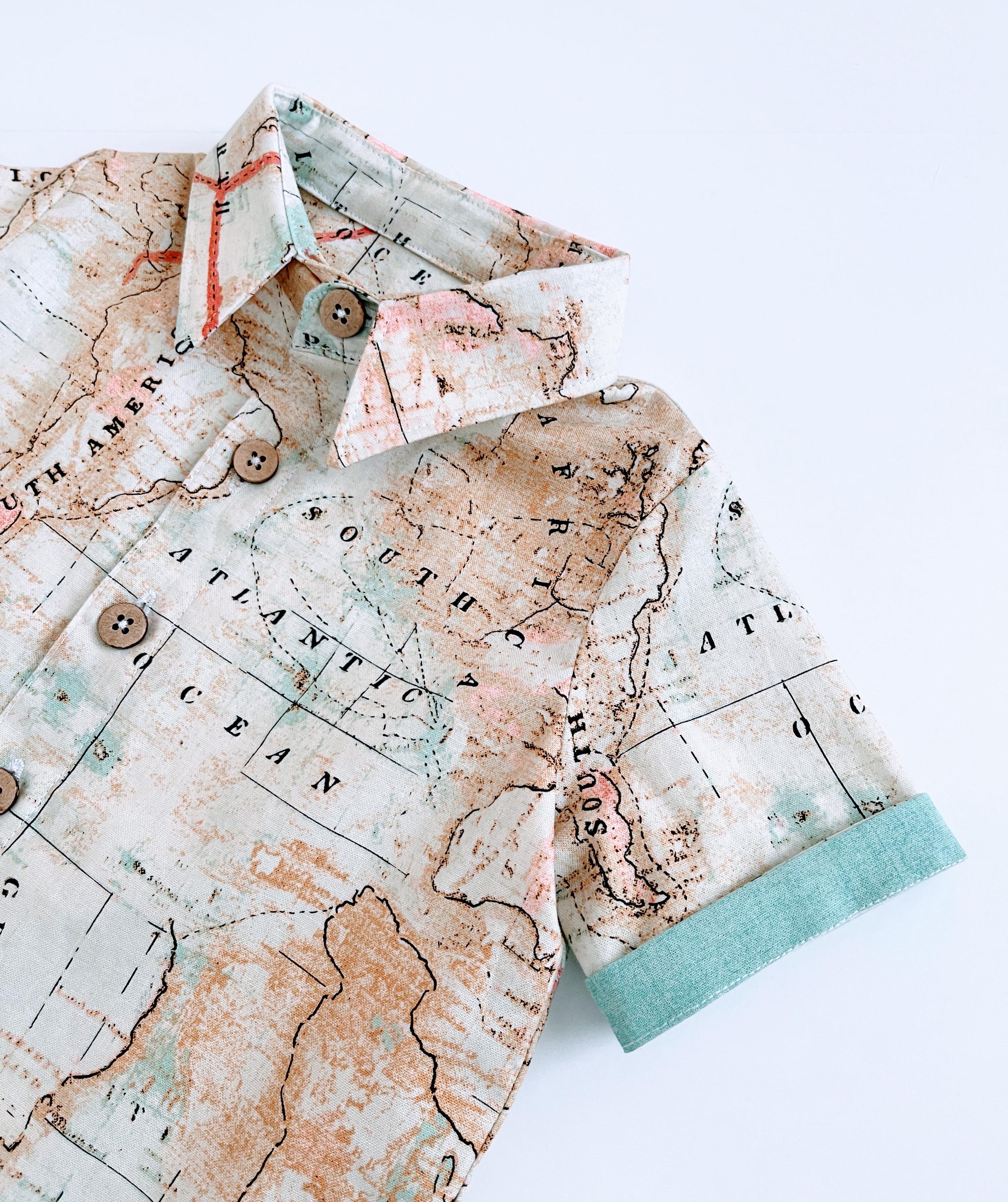 Let your little explorer’s style shine with this unique boy’s button-down shirt, featuring a vintage world map print! Perfect for adventurous spirits, this shirt is made with comfort and style in mind. The classic button-down design makes it easy to dress up for special occasions or wear casually for everyday adventures.