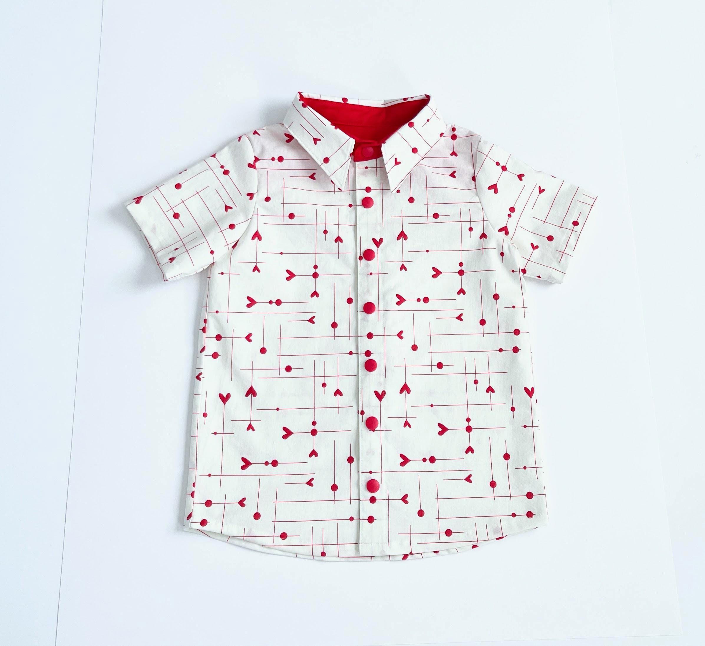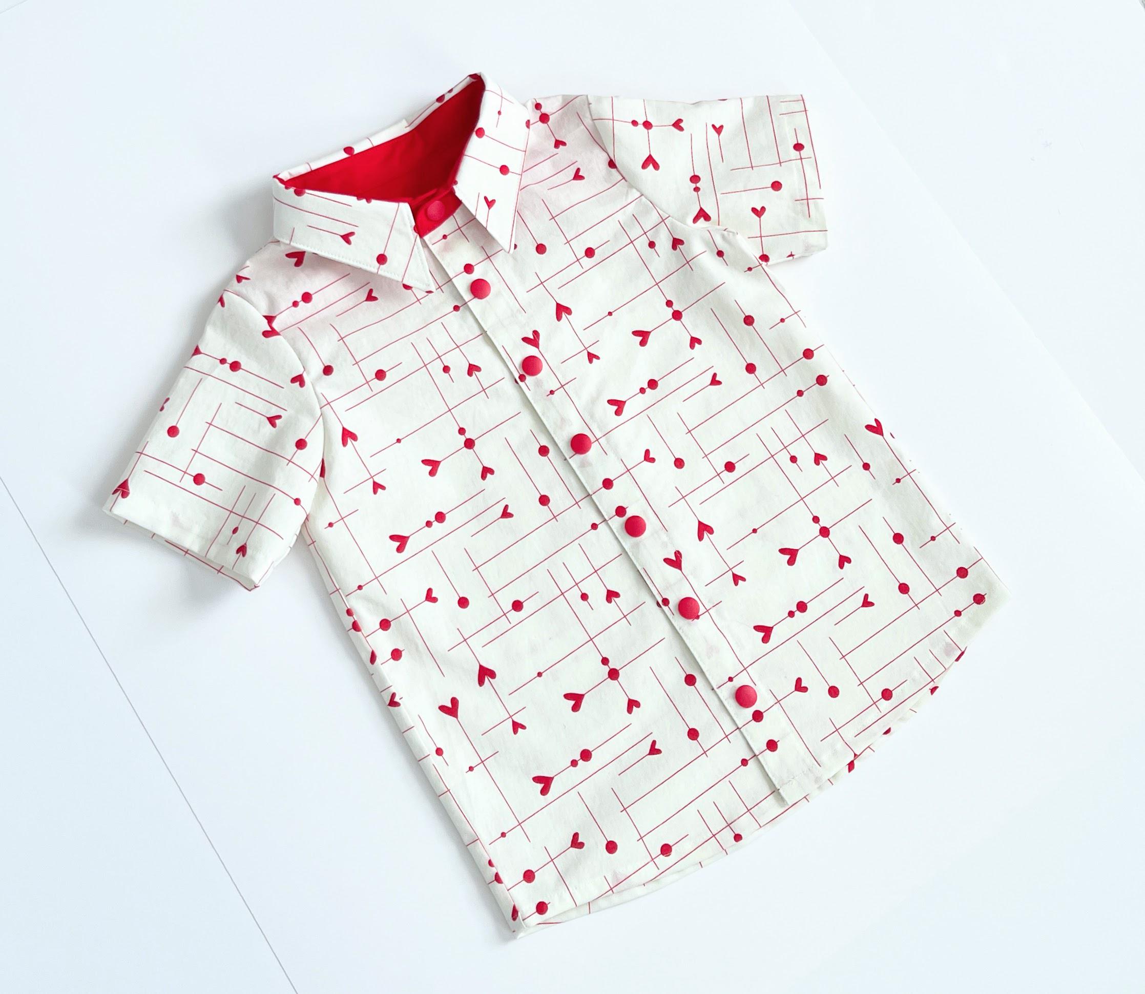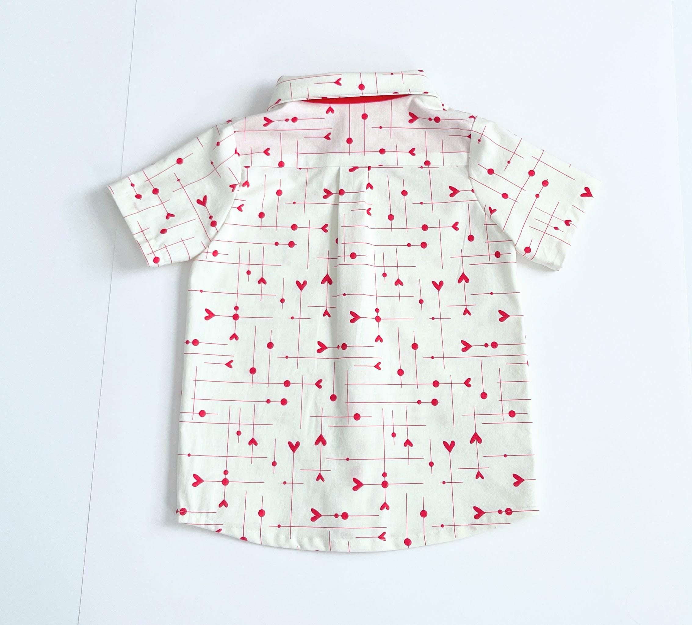 This charming ivory shirt features a playful and modern red heart and arrow pattern, perfect for your little one's special moments.