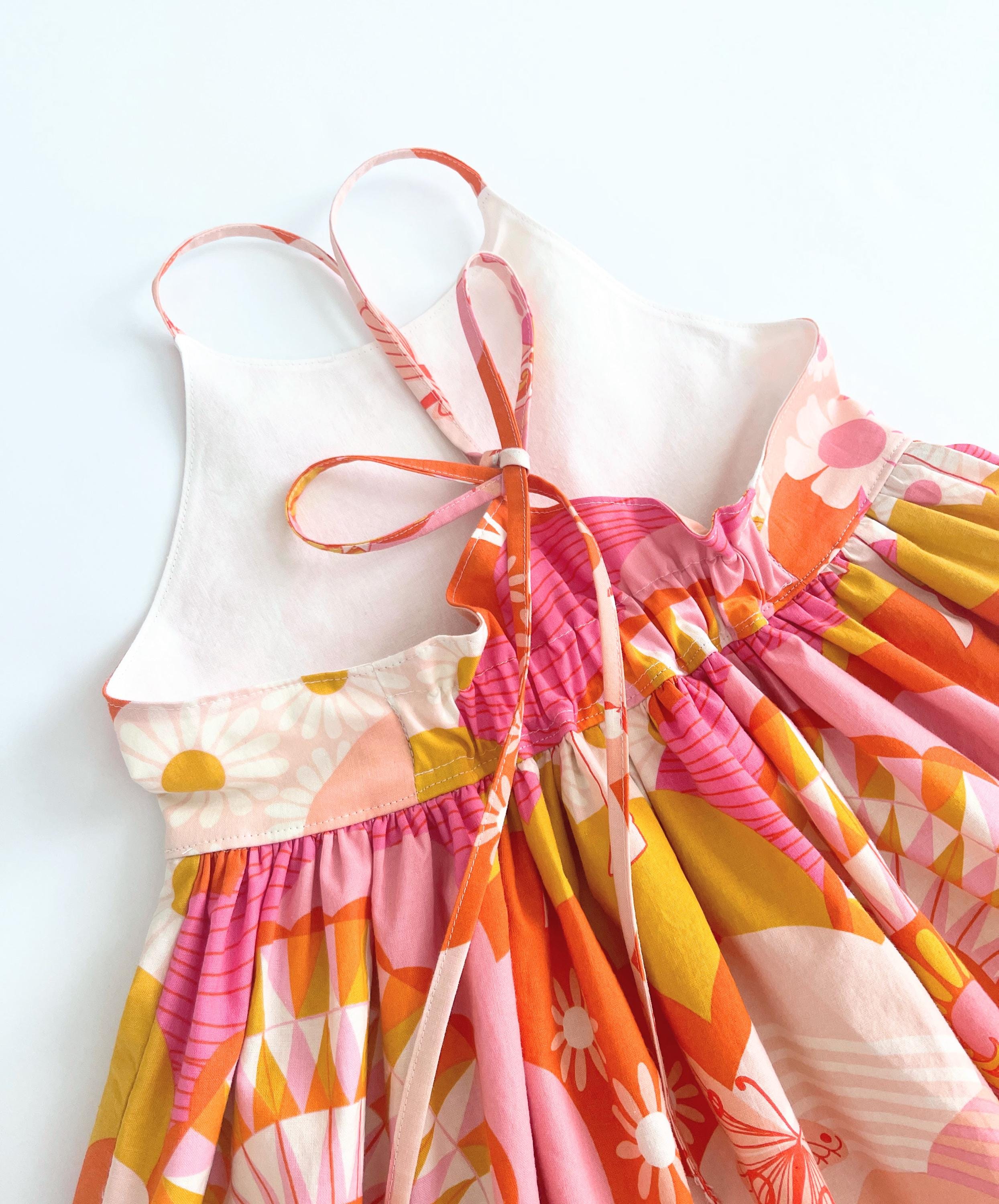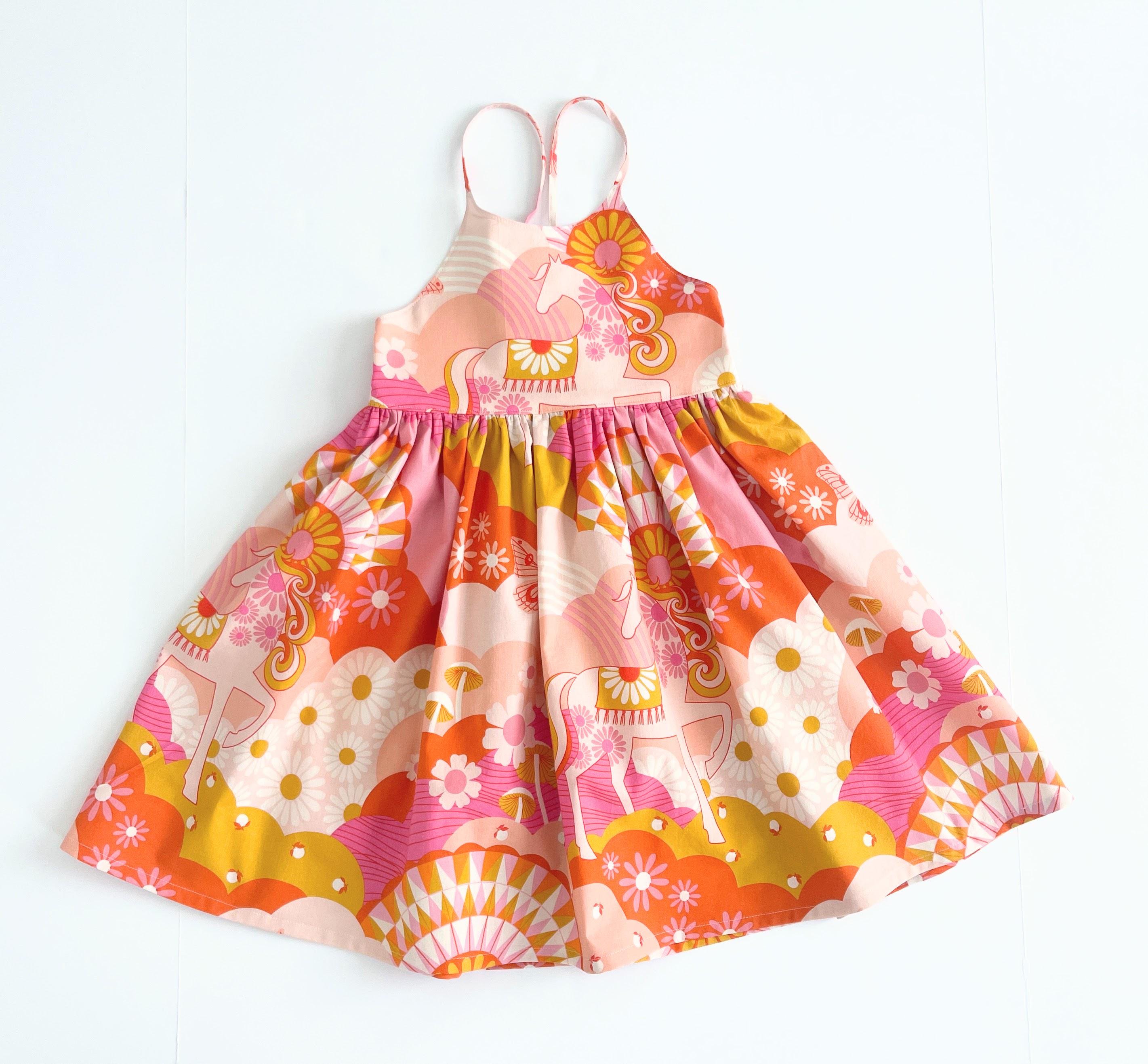 This beautiful boho dress is a showstopper, featuring a vibrant and whimsical print that's perfect for sunny days, parties, or any special occasion. The unique 1970s-style pattern features carousel horses, cheerful daisies, and bright suns in a gorgeous warm-weather palette of pink, orange, and yellow.