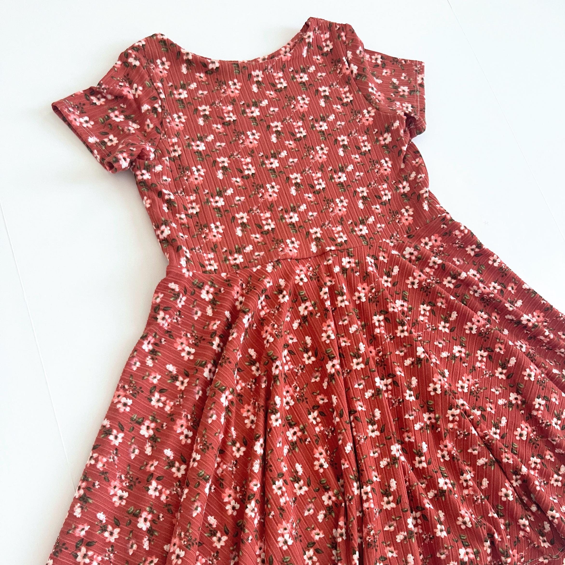 This sweet girl’s fall dress is made from a soft rib knit fabric that’s both cozy and comfortable—perfect for autumn days. Featuring an allover floral print on a warm rust background, this dress has a fitted bodice, short sleeves, and a full twirl skirt that little ones will love to spin in.