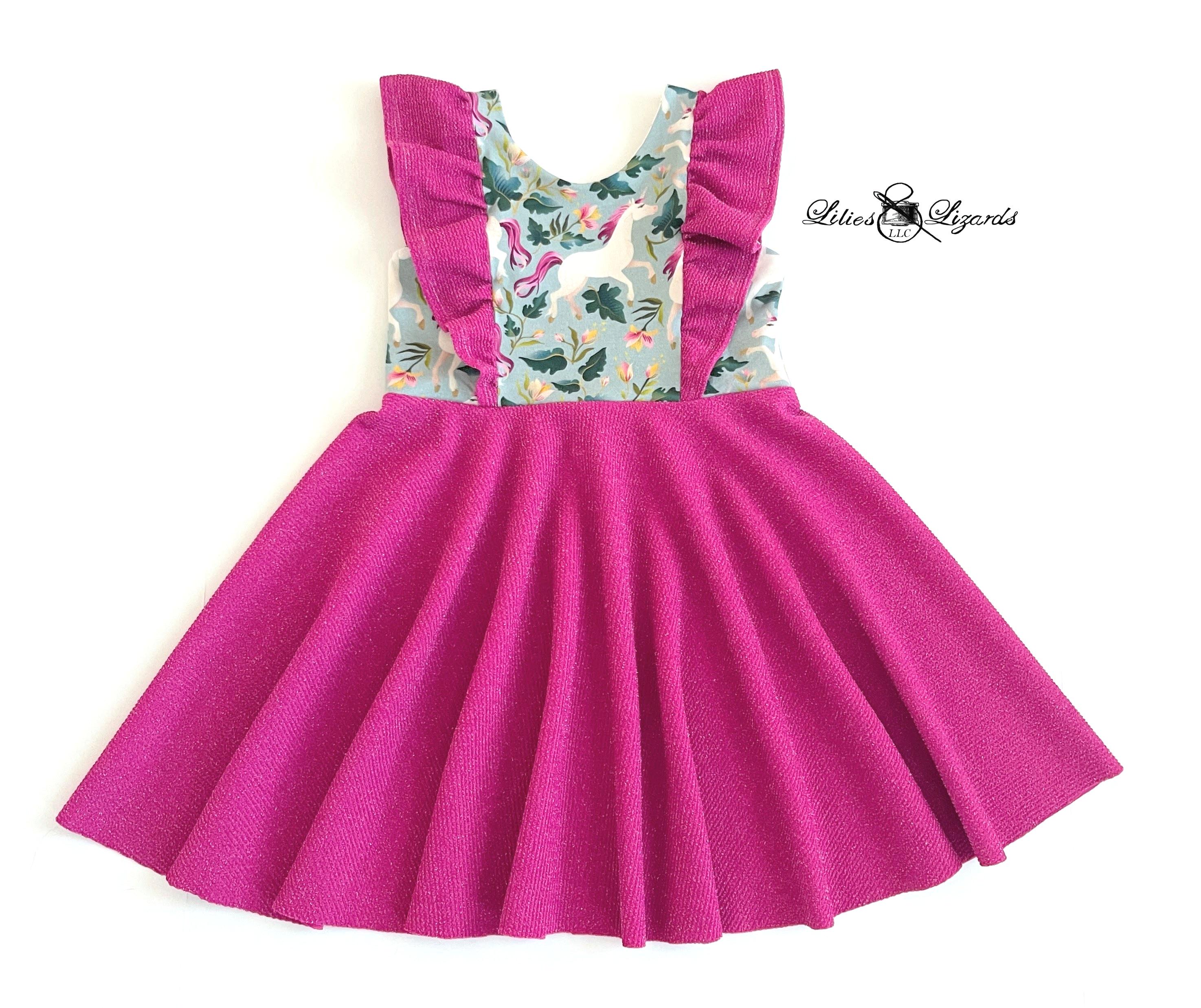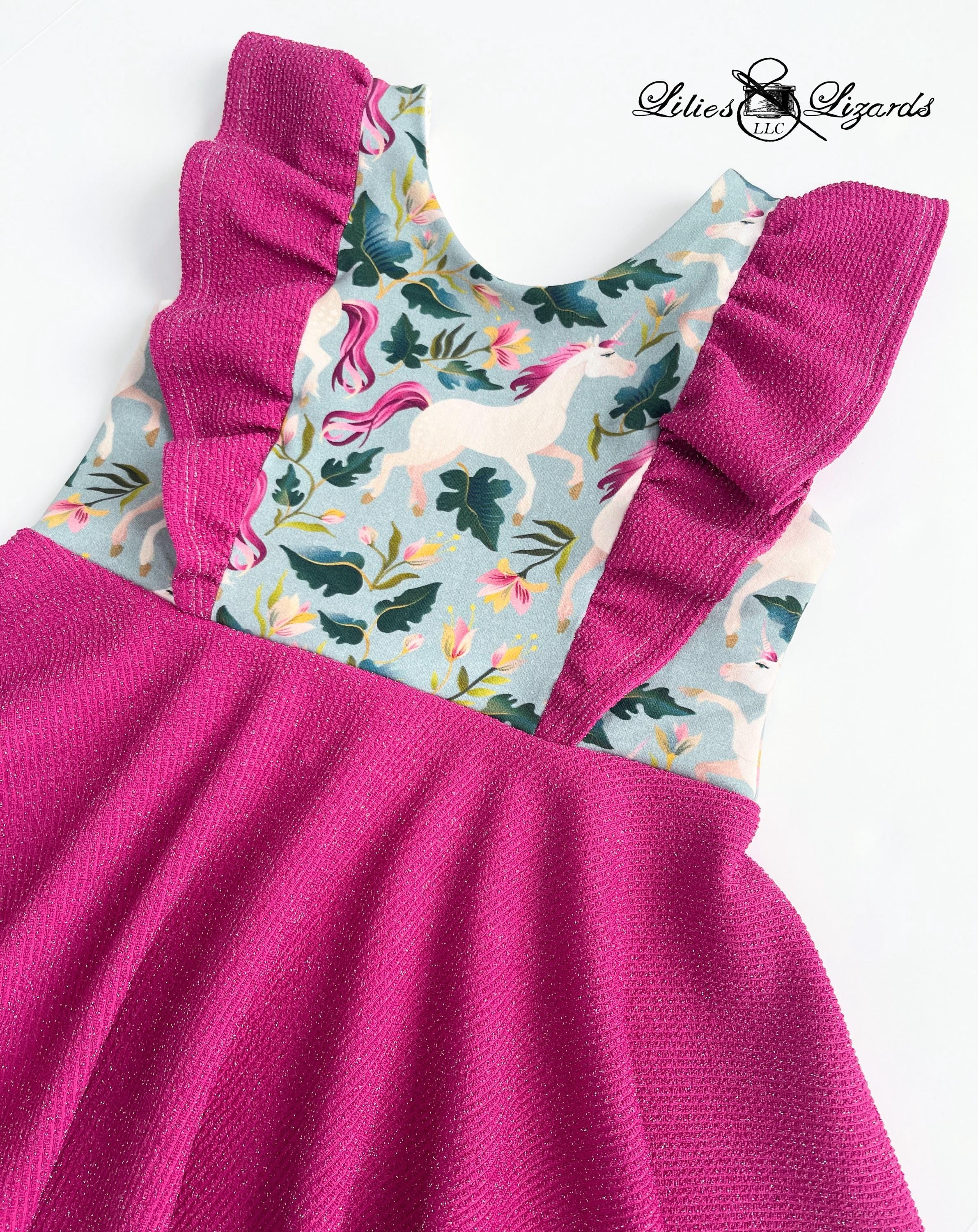 Make her magical dreams come true with this enchanting unicorn ruffled dress! Lovingly handmade, this dress is designed for ultimate twirls and endless adventures. The sparkly pink skirt catches the light with every spin, while the whimsical unicorn and floral print bodice add a touch of fantasy. It's the perfect outfit for birthdays, photoshoots, or any day that needs a little extra sparkle.