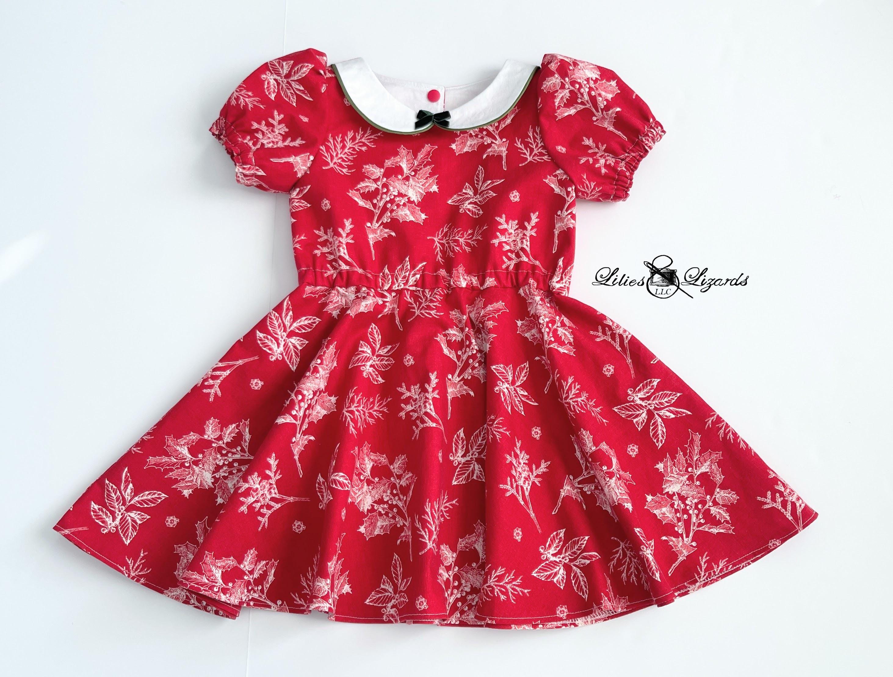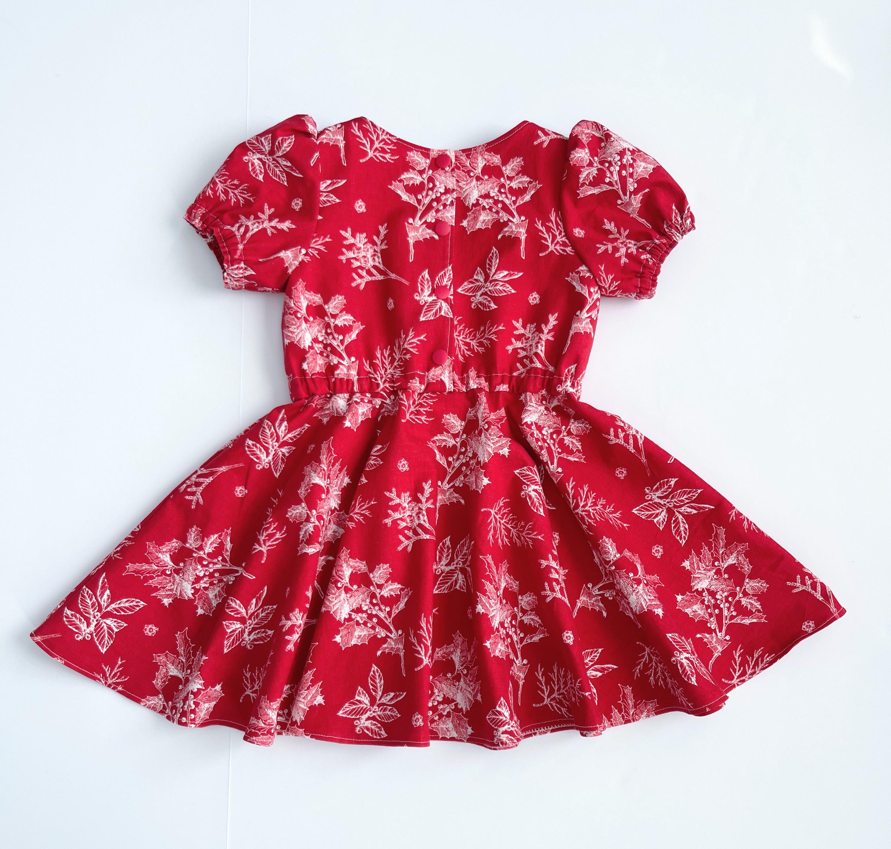 The star of the show is the beautiful red fabric, featuring a classic, all-over white winter botanical print of holly and winter berries. The dress is designed for a classic, comfortable fit with a relaxed fit bodice, gathered elastic waist, short puff sleeves, and full circle skirt, making it perfect for twirling.