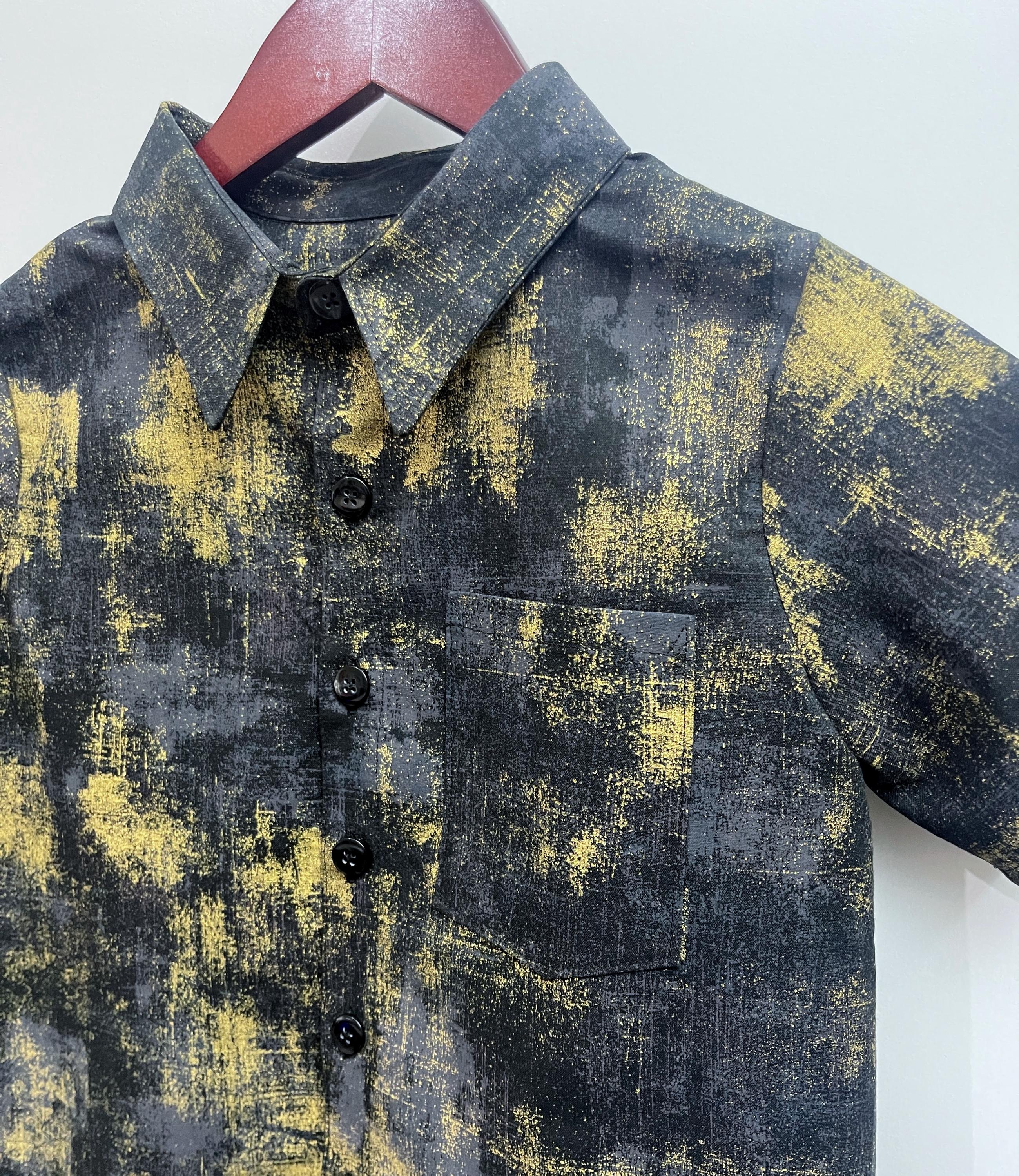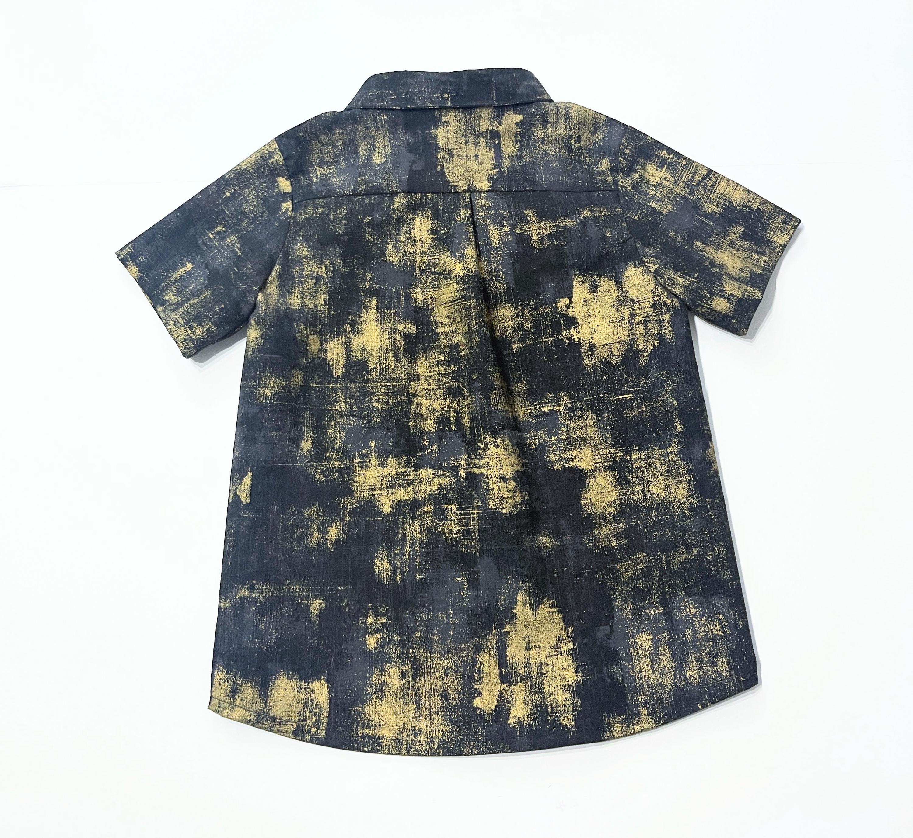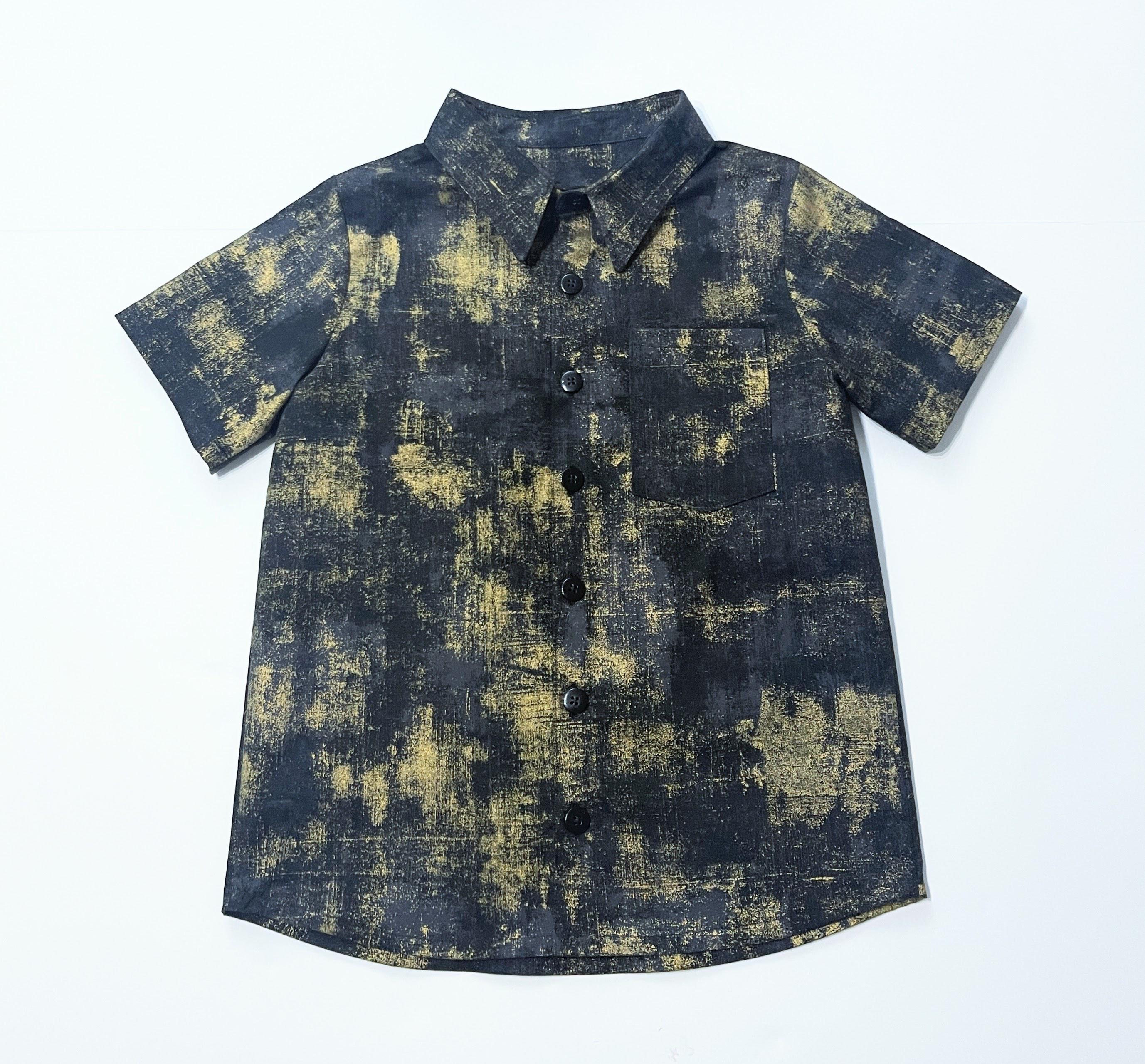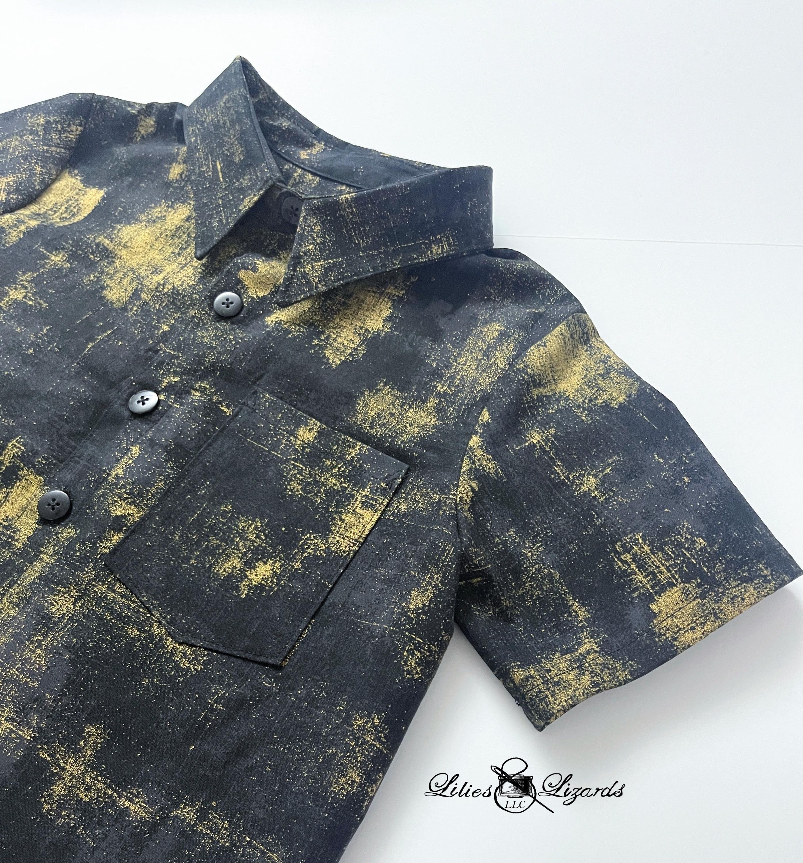 Handmade from 100% cotton fabric in onyx and gold metallic, this shirt features a front pocket, short sleeves, and a button-down front.