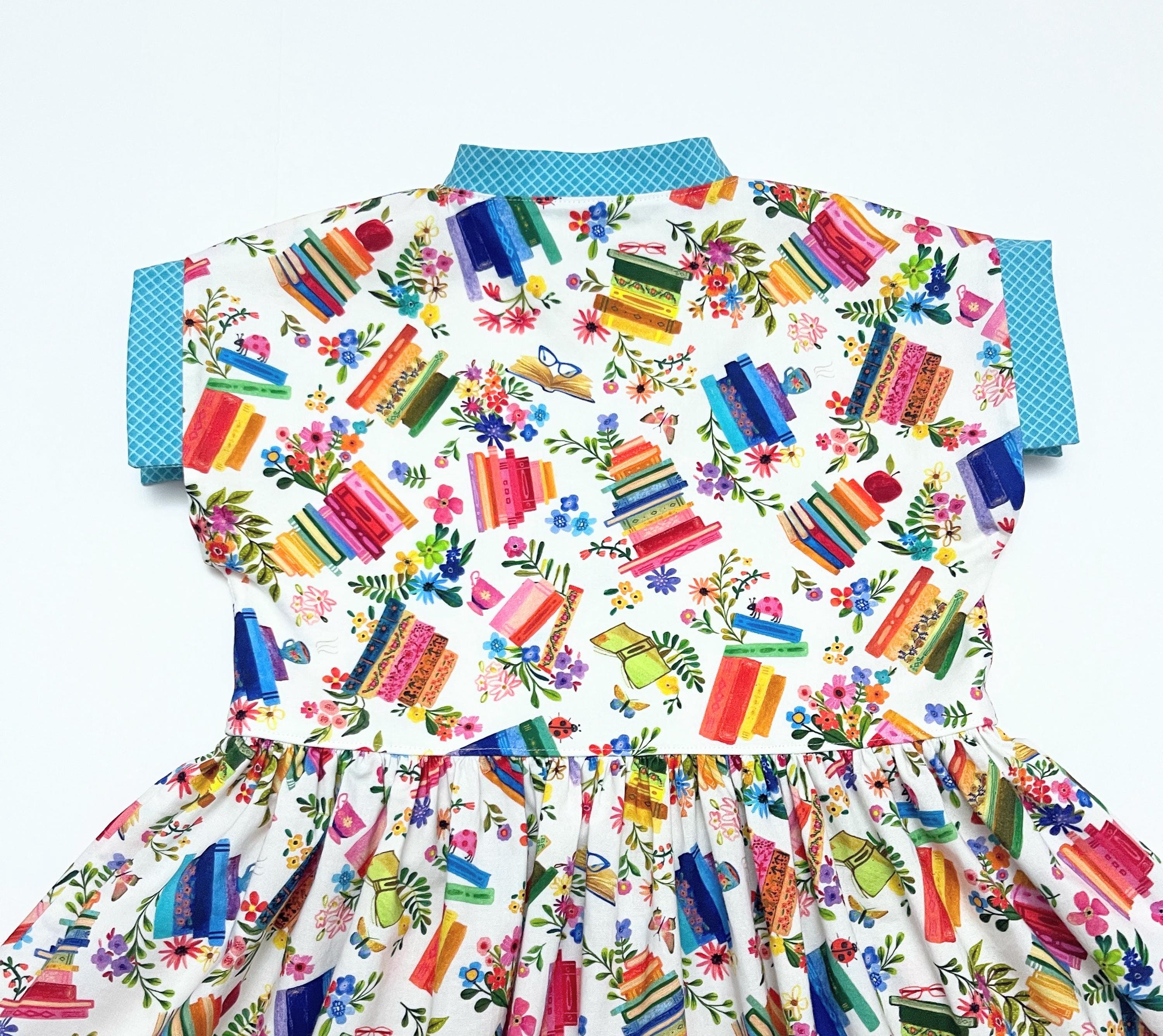 Perfect for back-to-school, library visits, or a themed birthday party, this vibrant handmade dress features a whimsical watercolor print of stacked books, delicate florals, ladybugs, and butterflies.