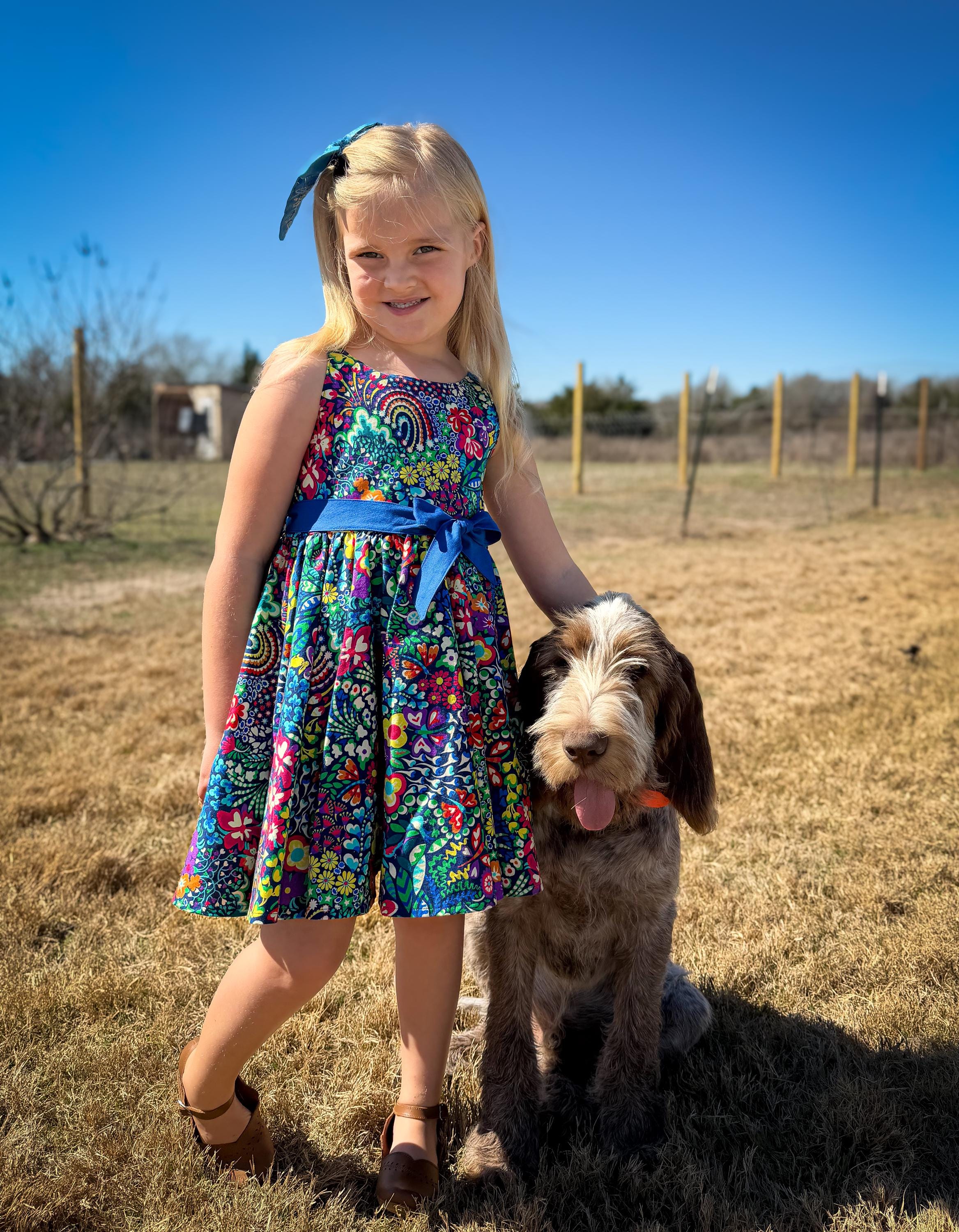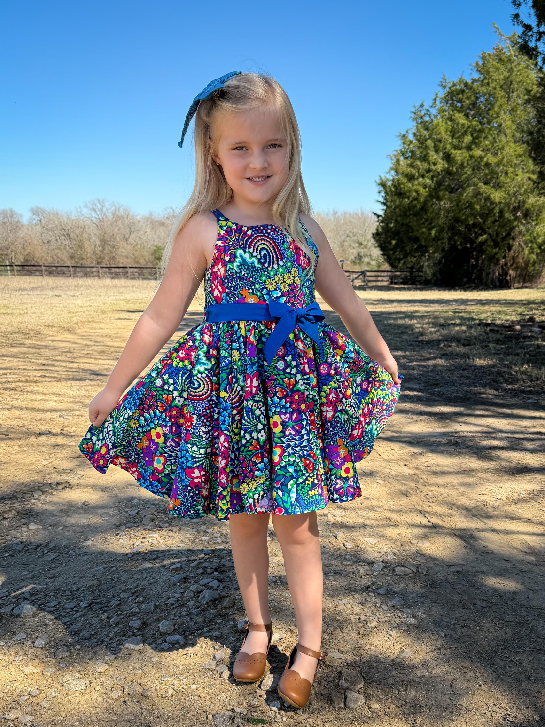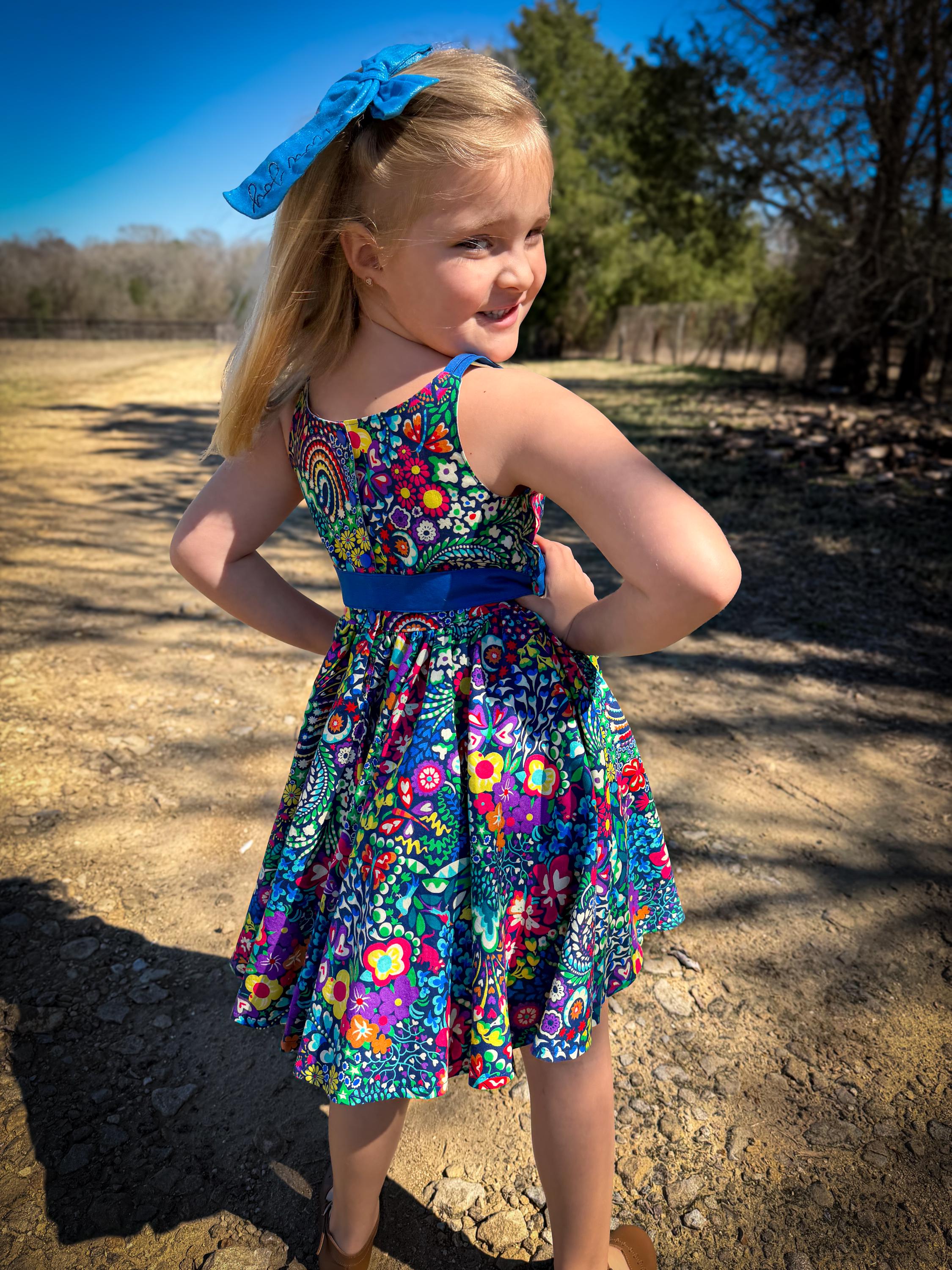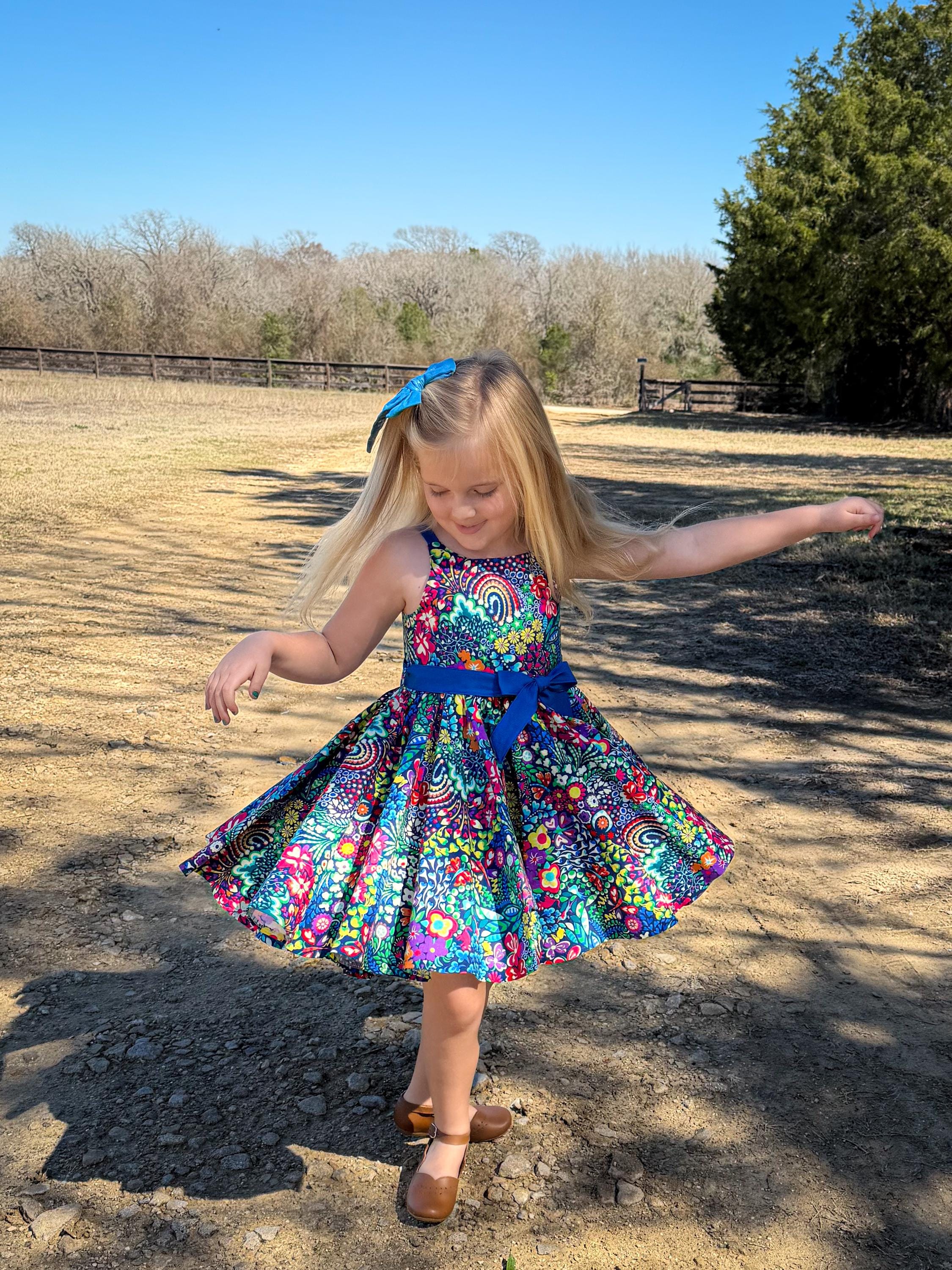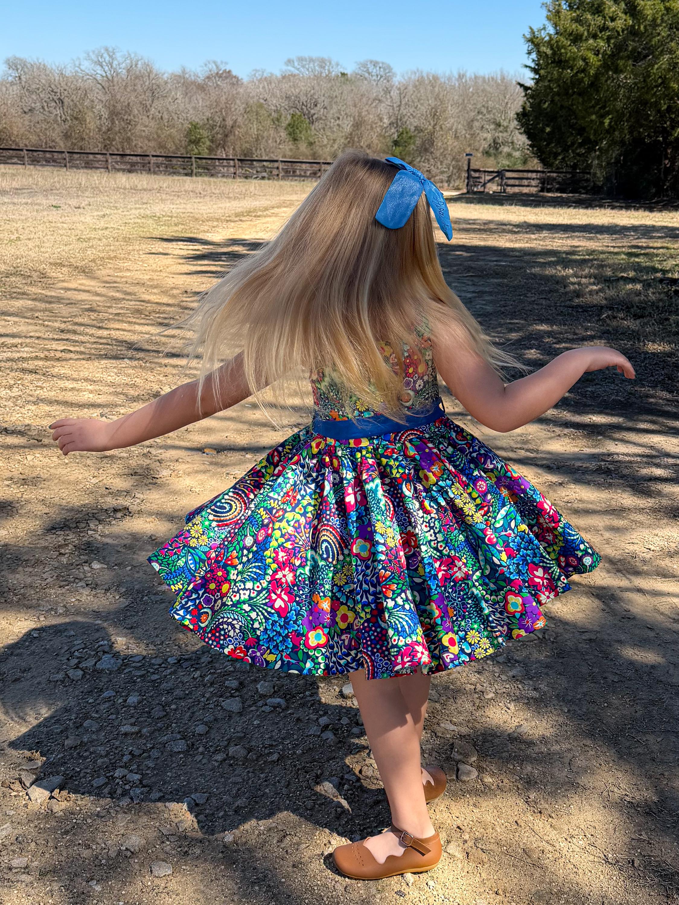Make every day a celebration with this stunning, high-energy floral dress. Featuring a maximalist print and a full, gathered double circle skirt, this piece is designed for twirling, playing, and making memories. Give her a wardrobe favorite that is as bold and bright as her personality! This isn't just a dress; it’s a handmade heirloom piece designed for the biggest smiles and the best twirls. Whether she’s attending a spring wedding, celebrating a birthday, or just turning the backyard into a fairytale kingdom, this dress is the showstopper she’s been waiting for.