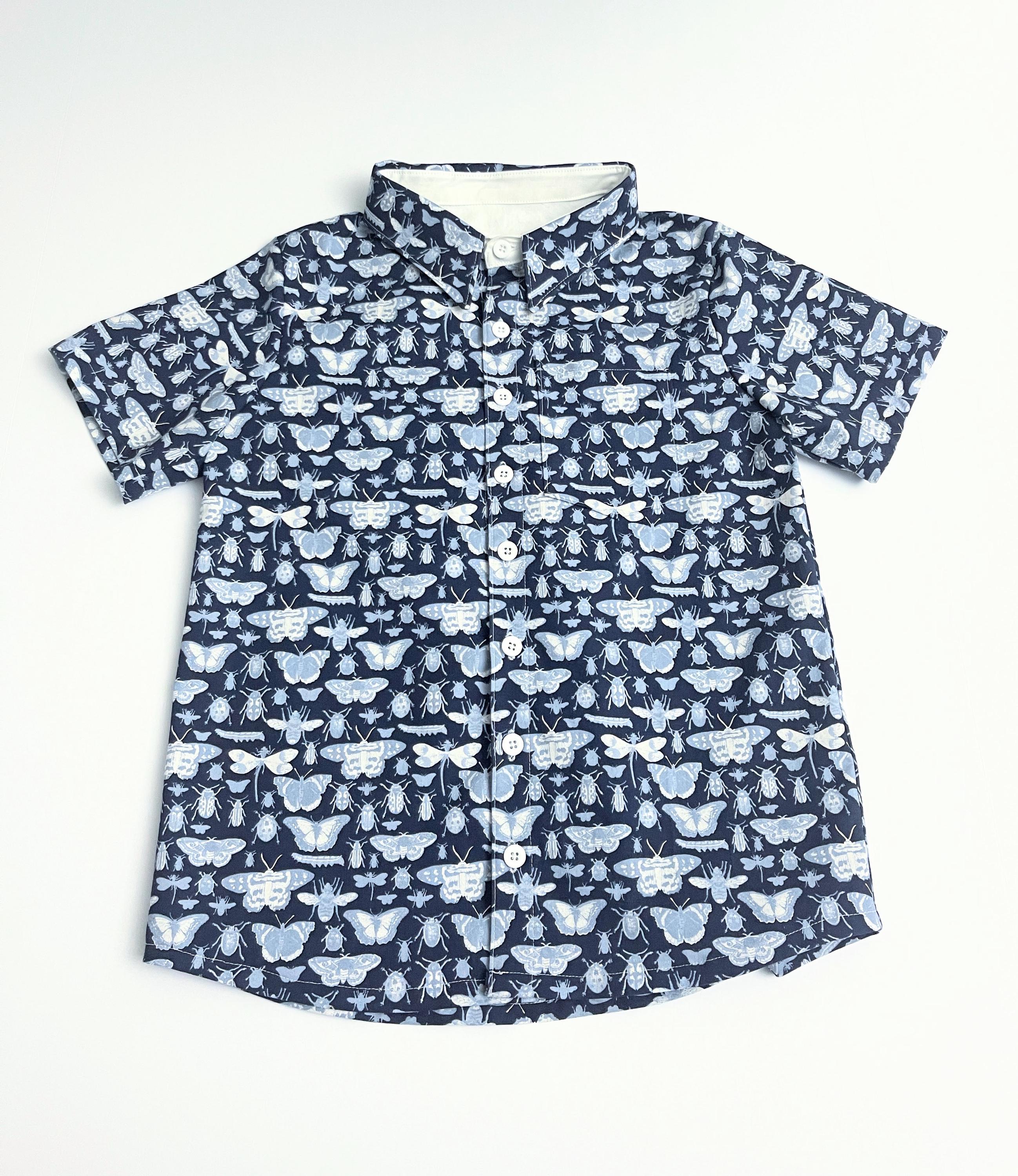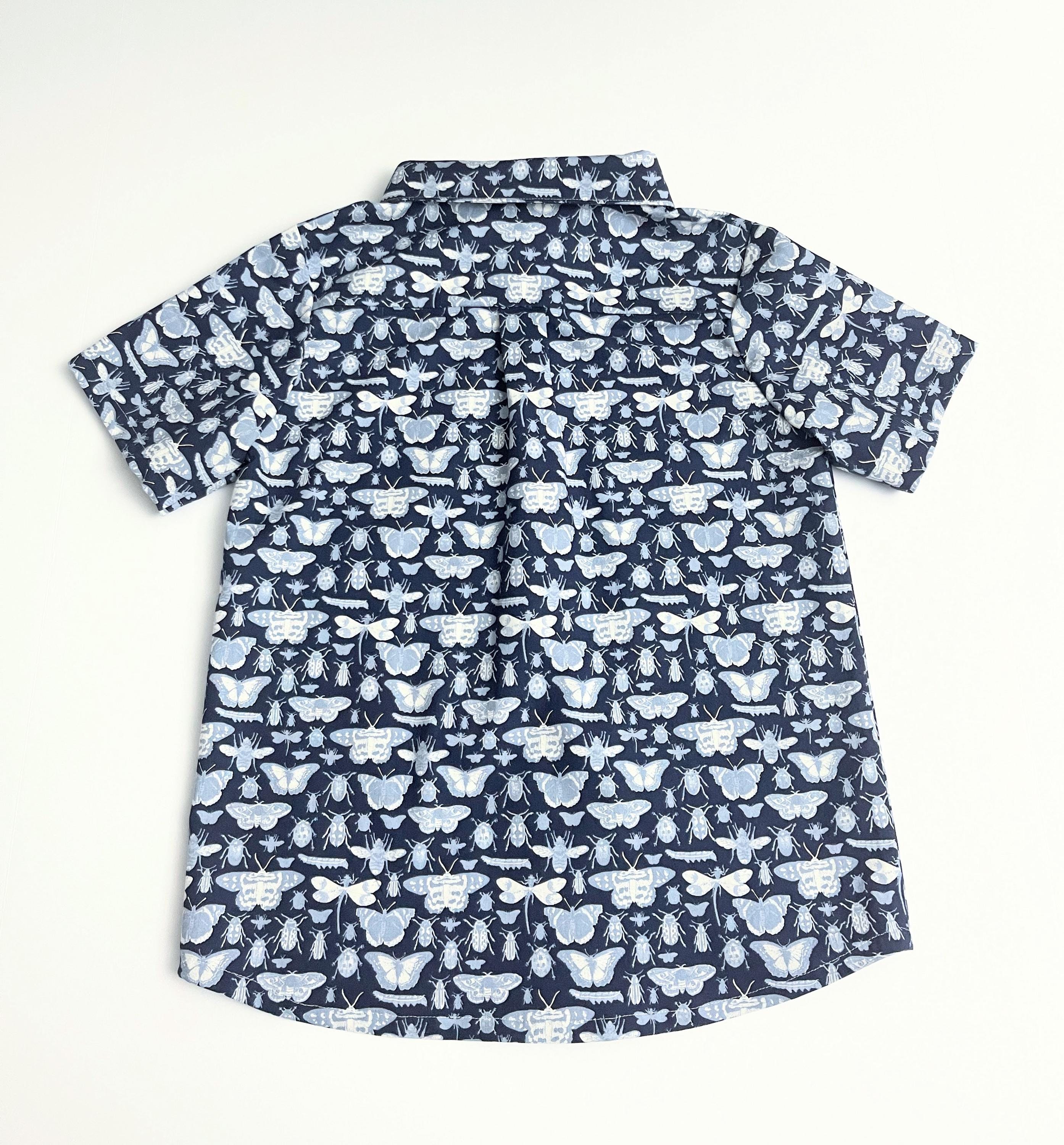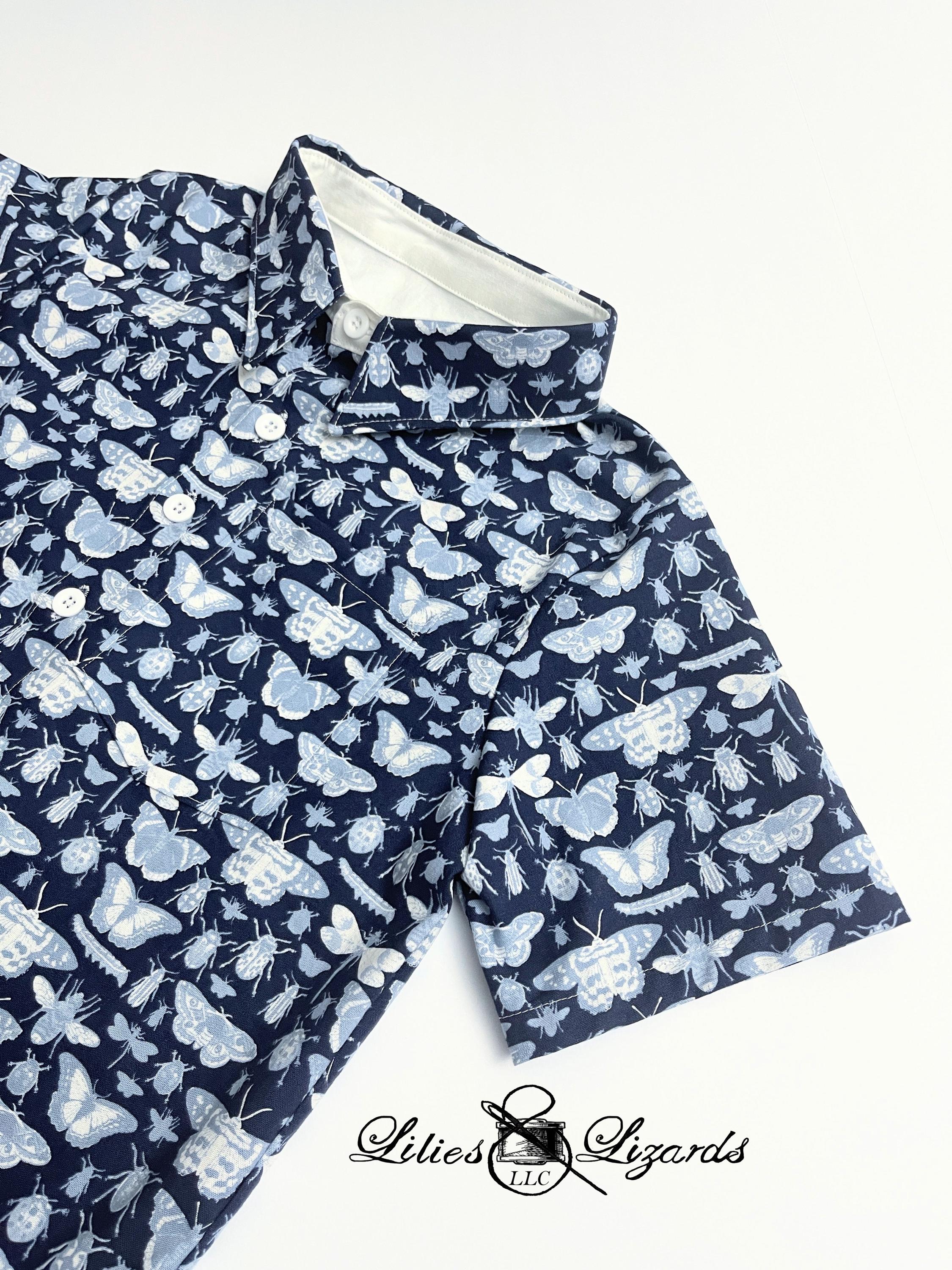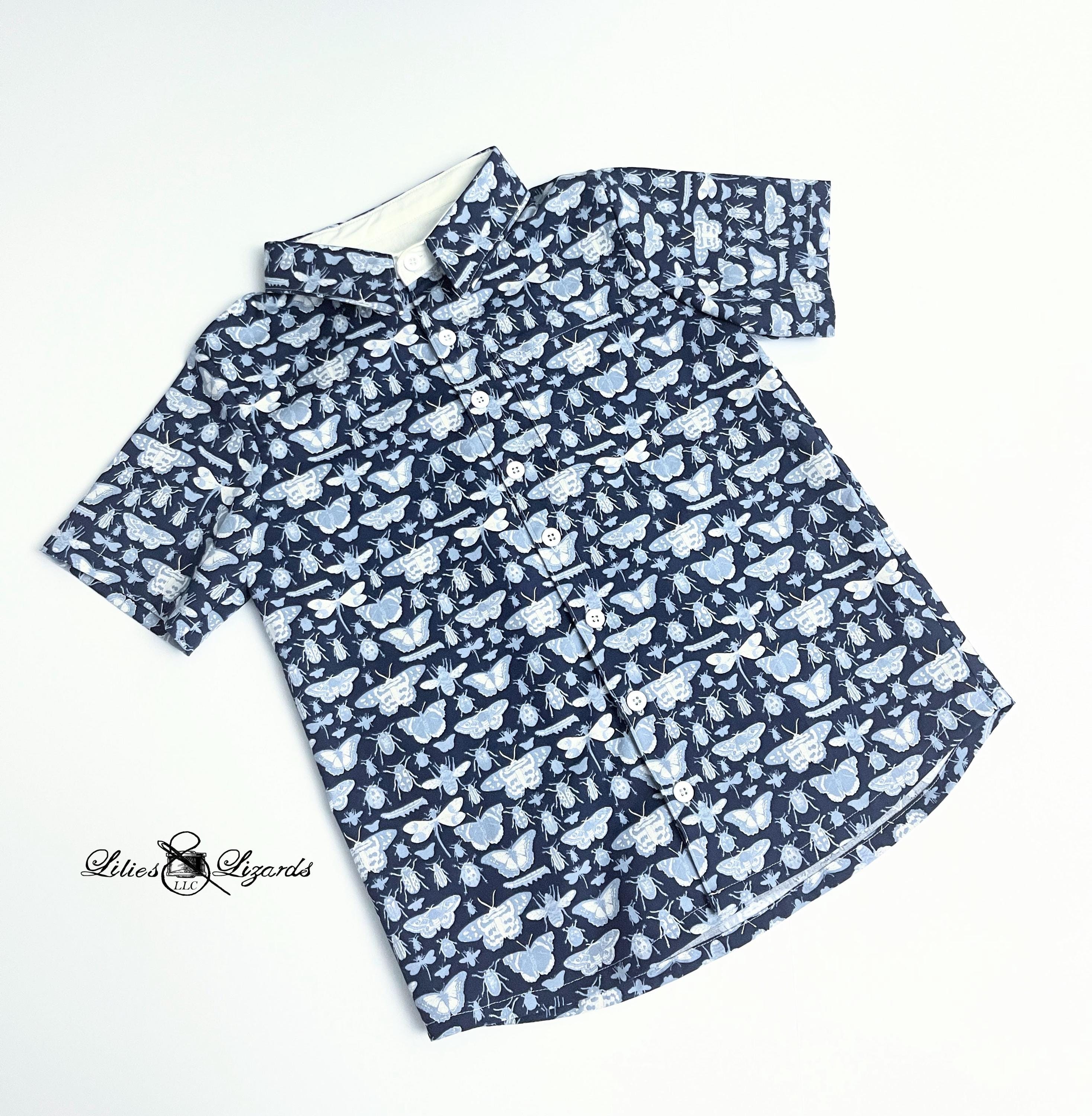 Handcrafted with love at Lilies & Lizards LLC, this short-sleeve button-down is designed for the little adventurer who appreciates the finer details—literally! Featuring an intricate, vintage-inspired print of butterflies, beetles, and dragonflies in soothing shades of blue, this shirt strikes the perfect balance between "dressed up" and "ready to play."