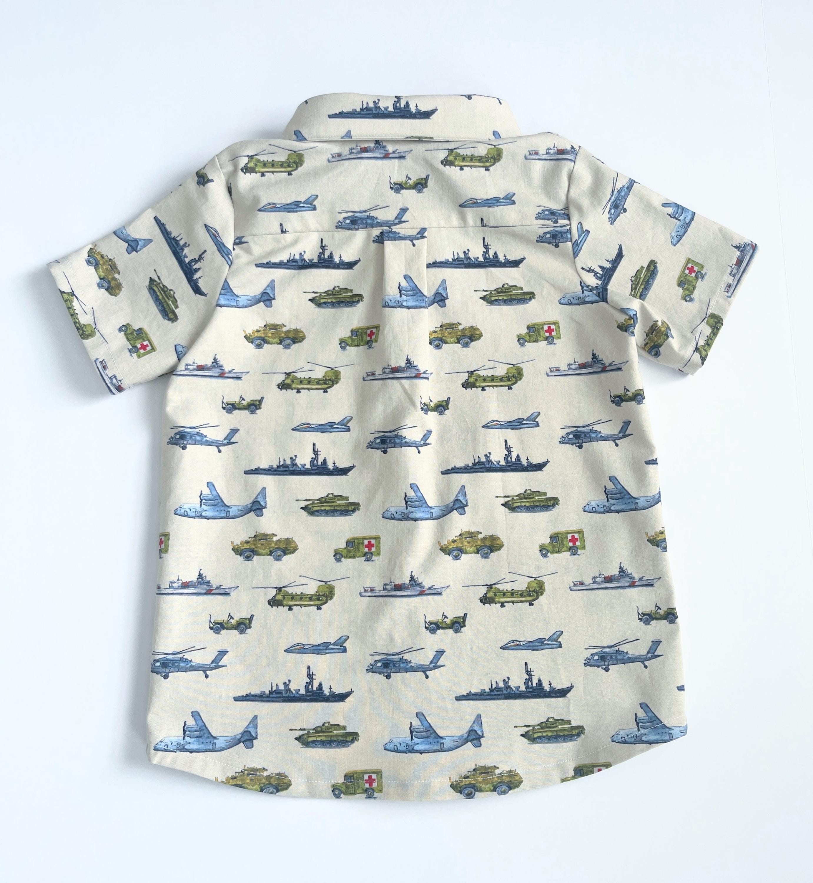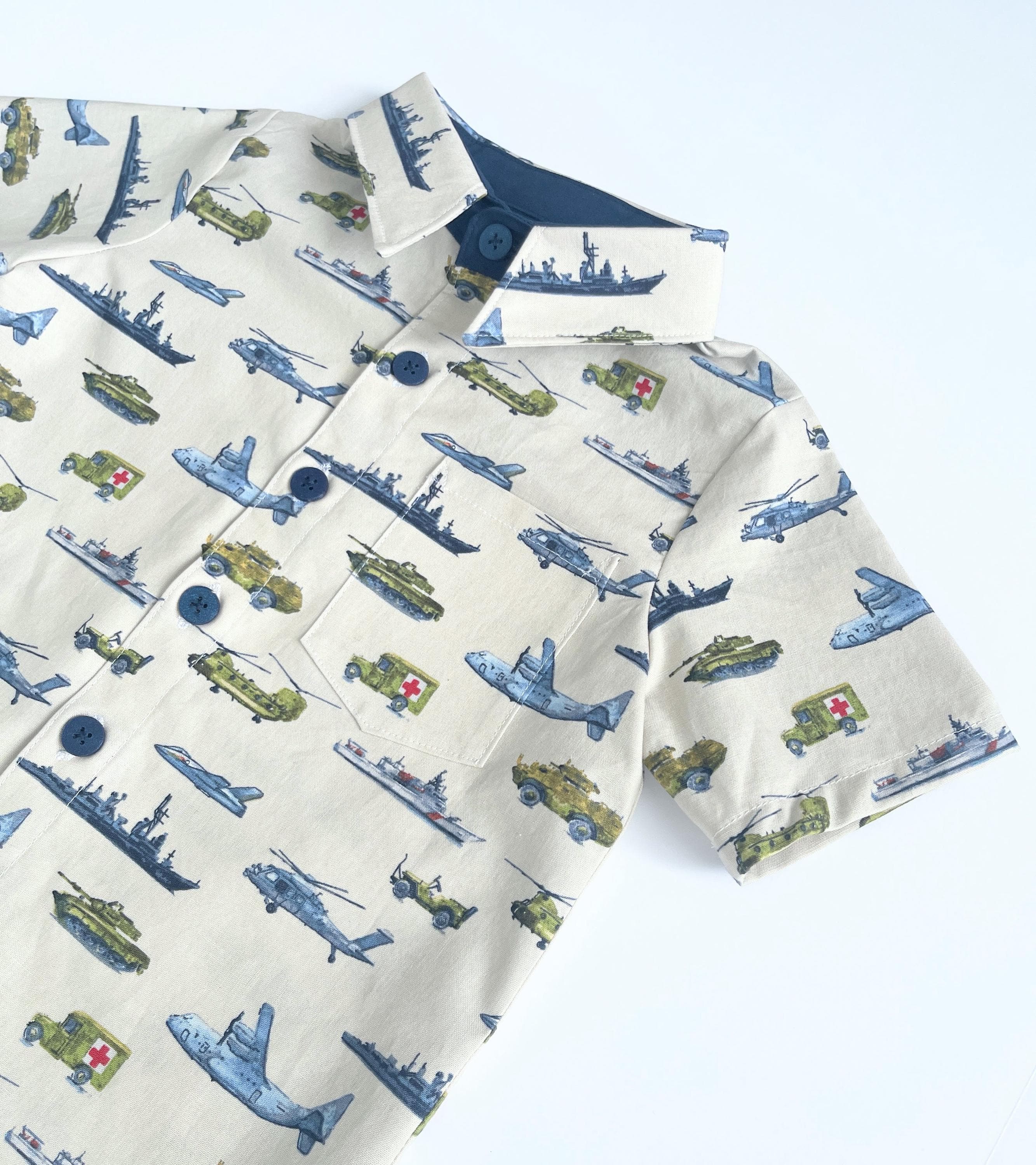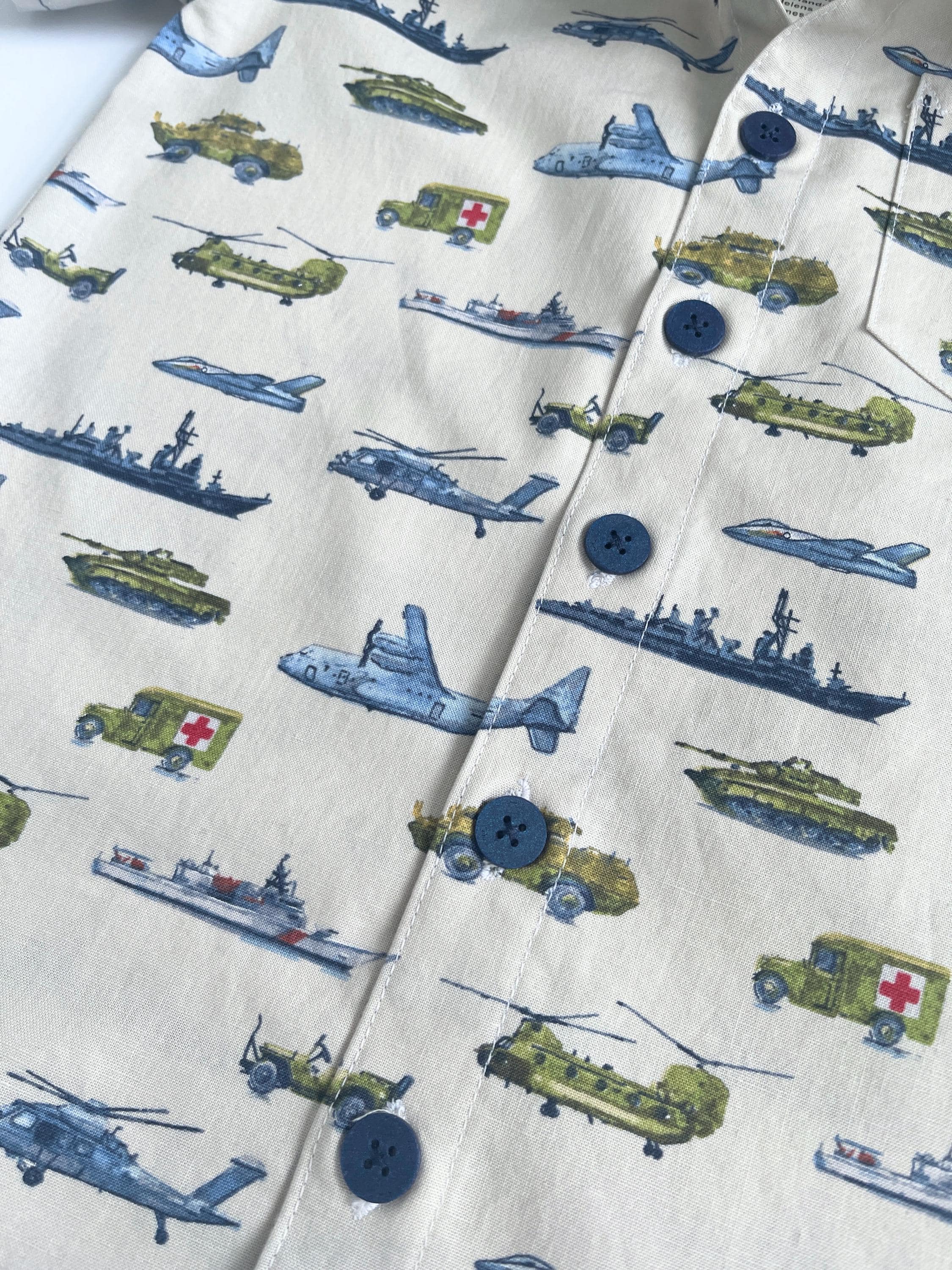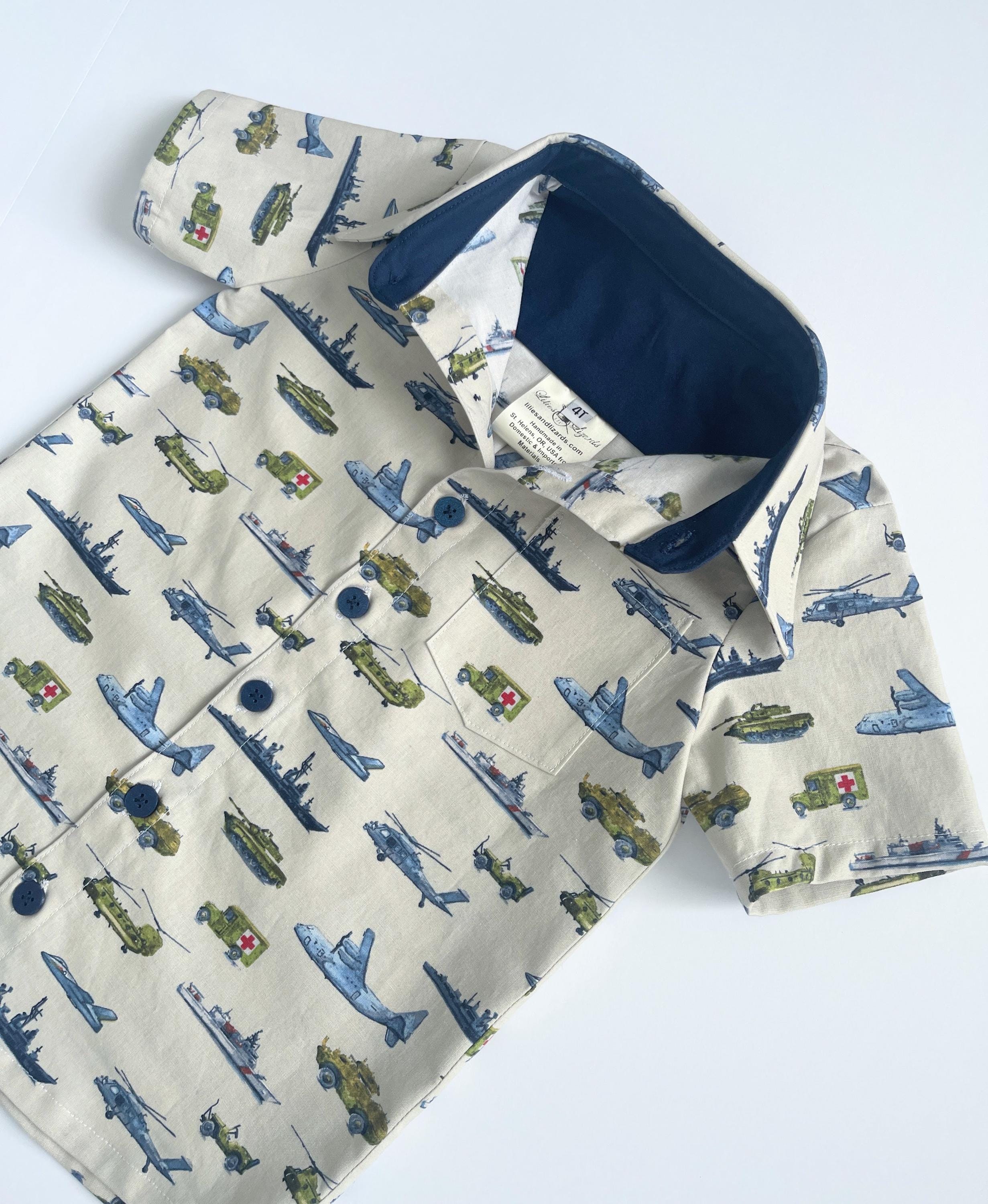 Dreaming of the high seas or the open skies, this handmade button-down is the perfect addition to any boy's wardrobe. Featuring a print of military helicopters, naval ships, fighter jets, and rescue vehicles, this is a shirt any serviceman/woman's child should own.