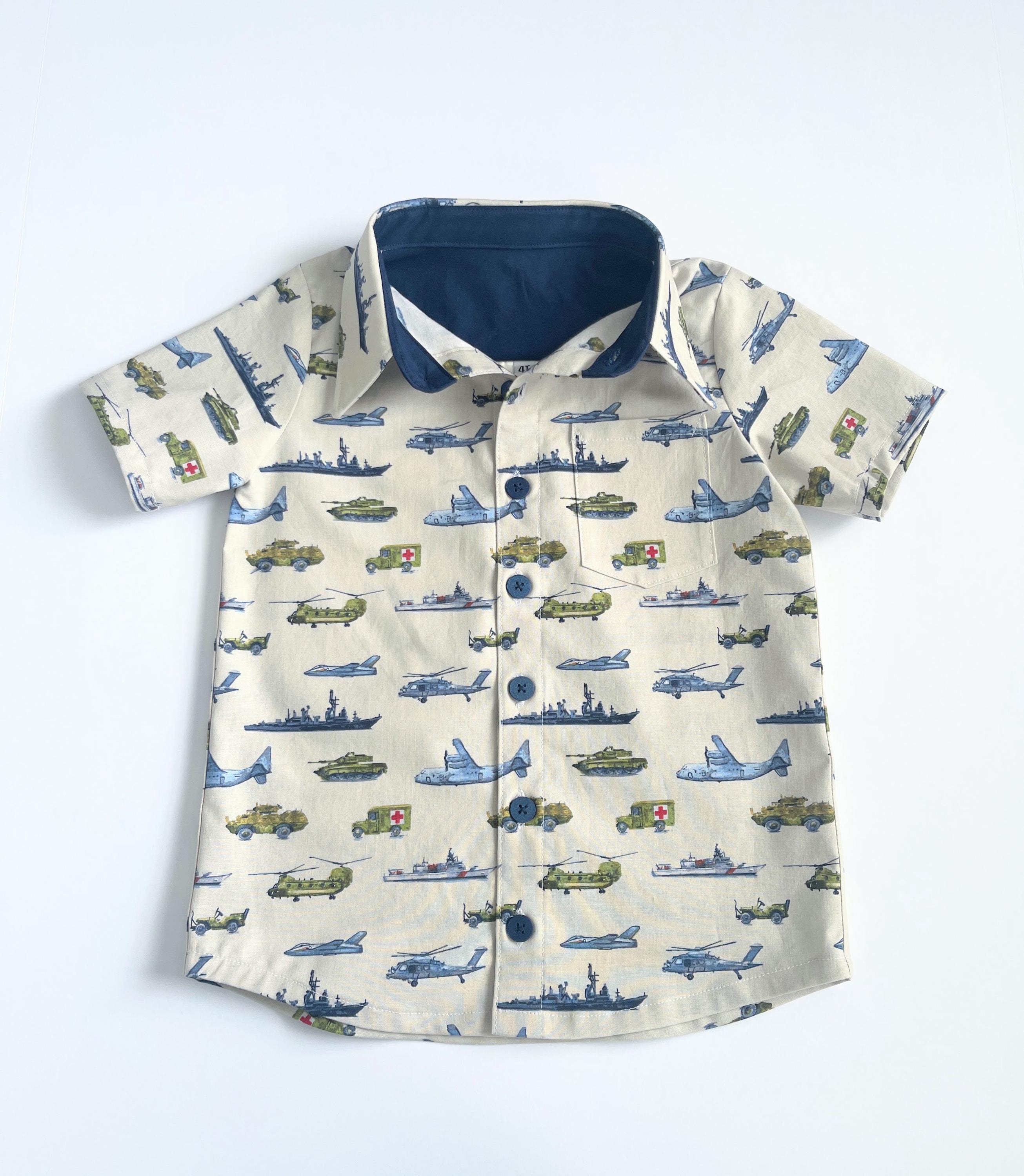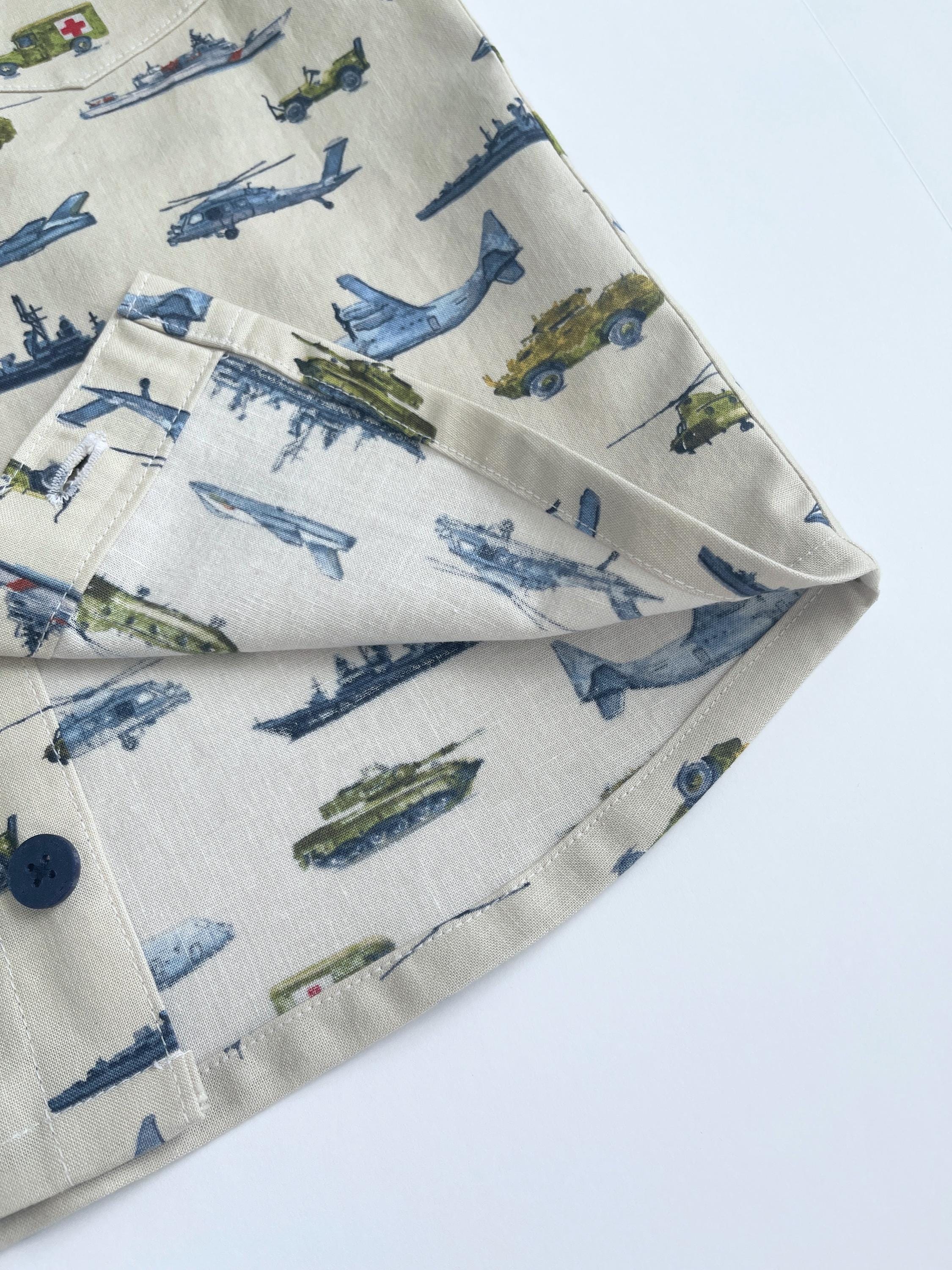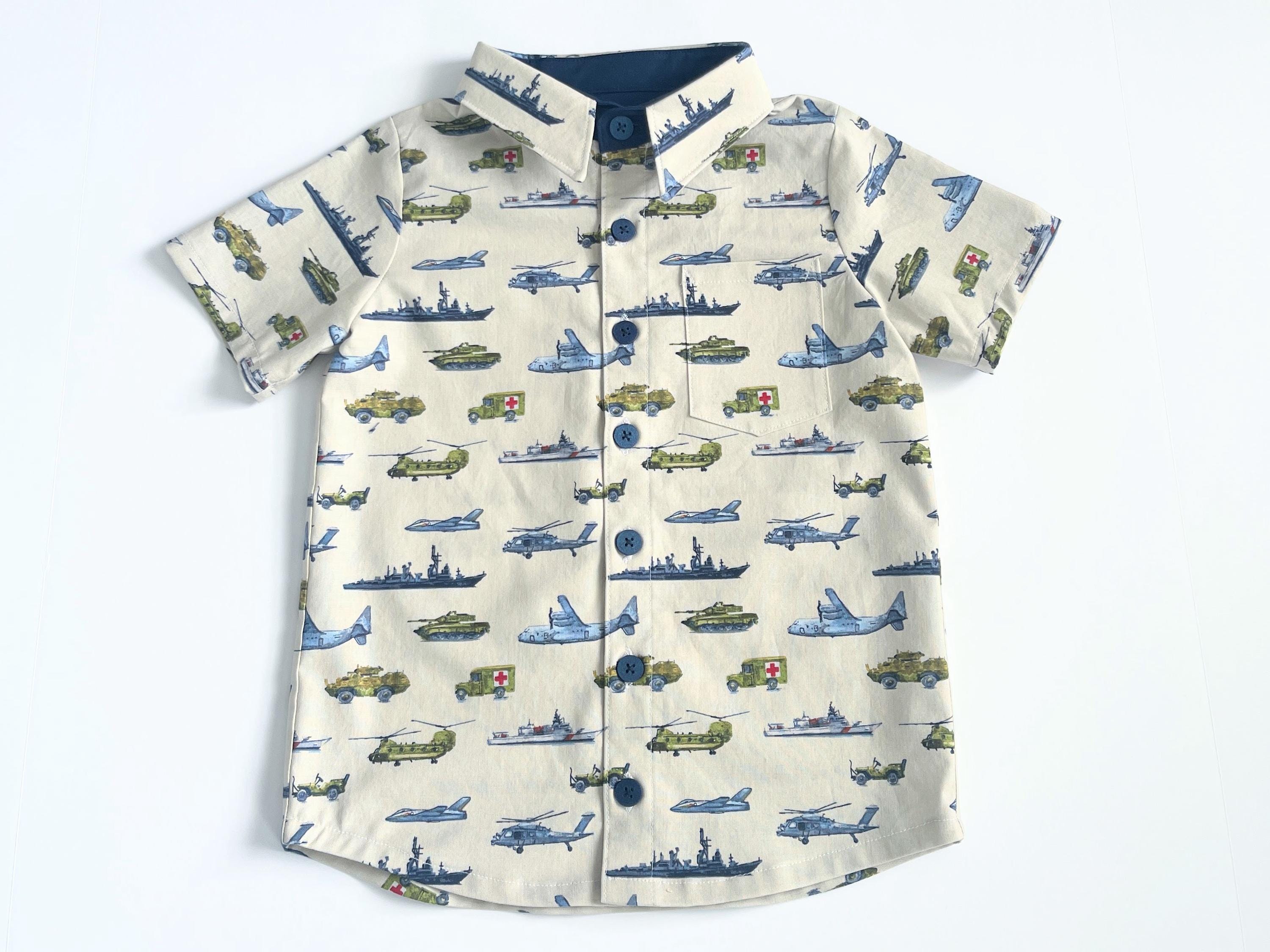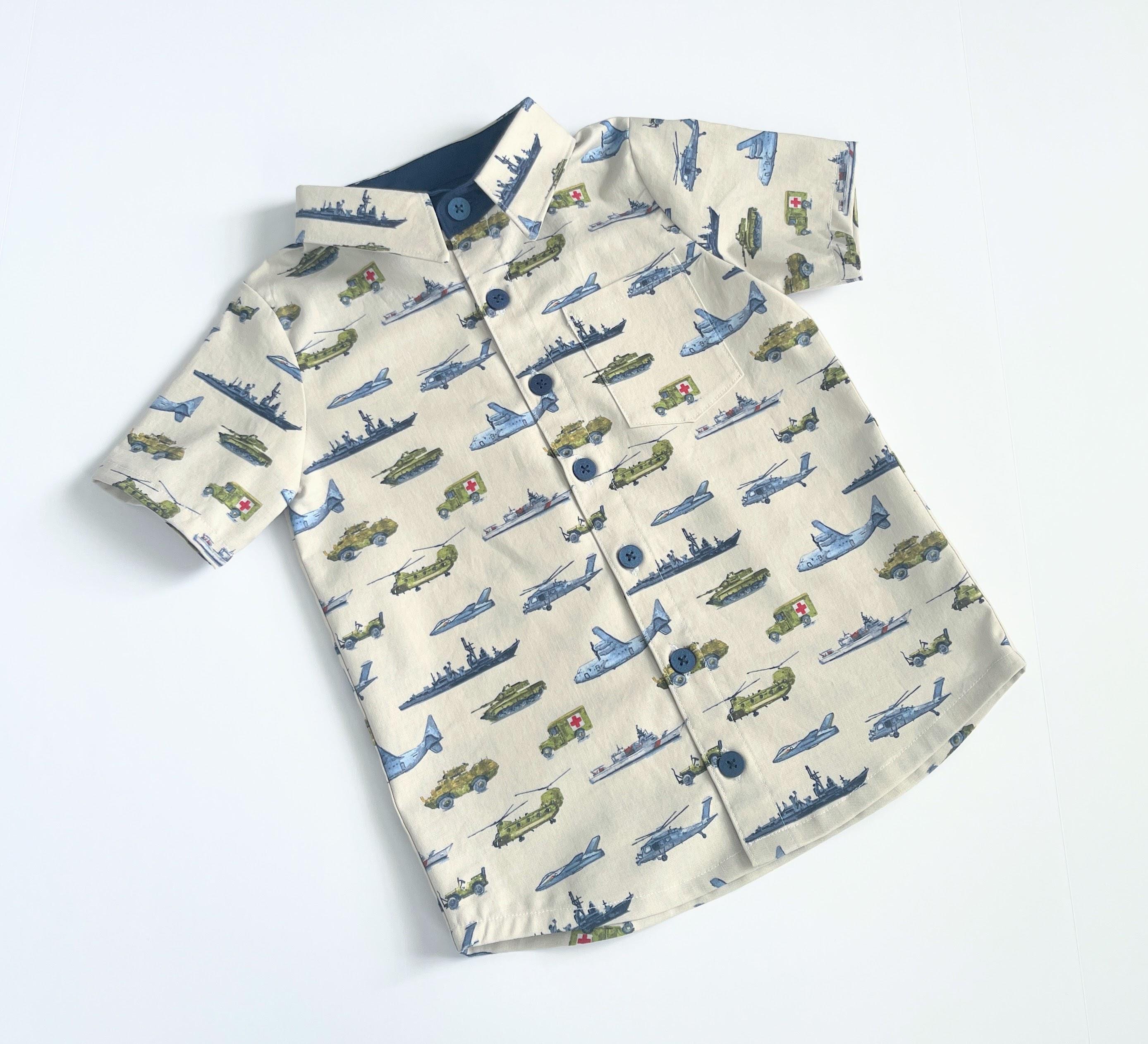 Dreaming of the high seas or the open skies, this handmade button-down is the perfect addition to any boy's wardrobe. Featuring a print of military helicopters, naval ships, fighter jets, and rescue vehicles, this is a shirt any serviceman/woman's child should own.