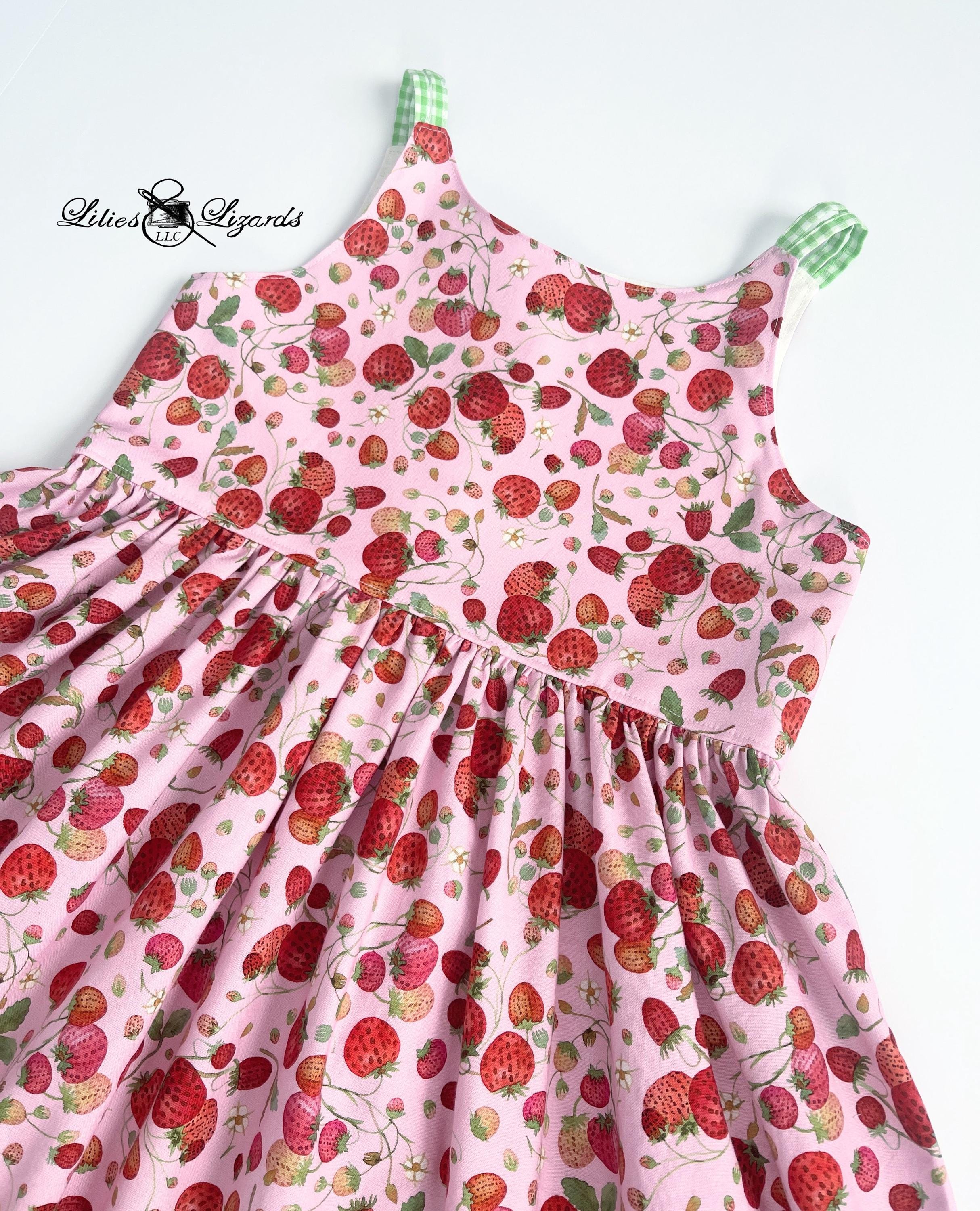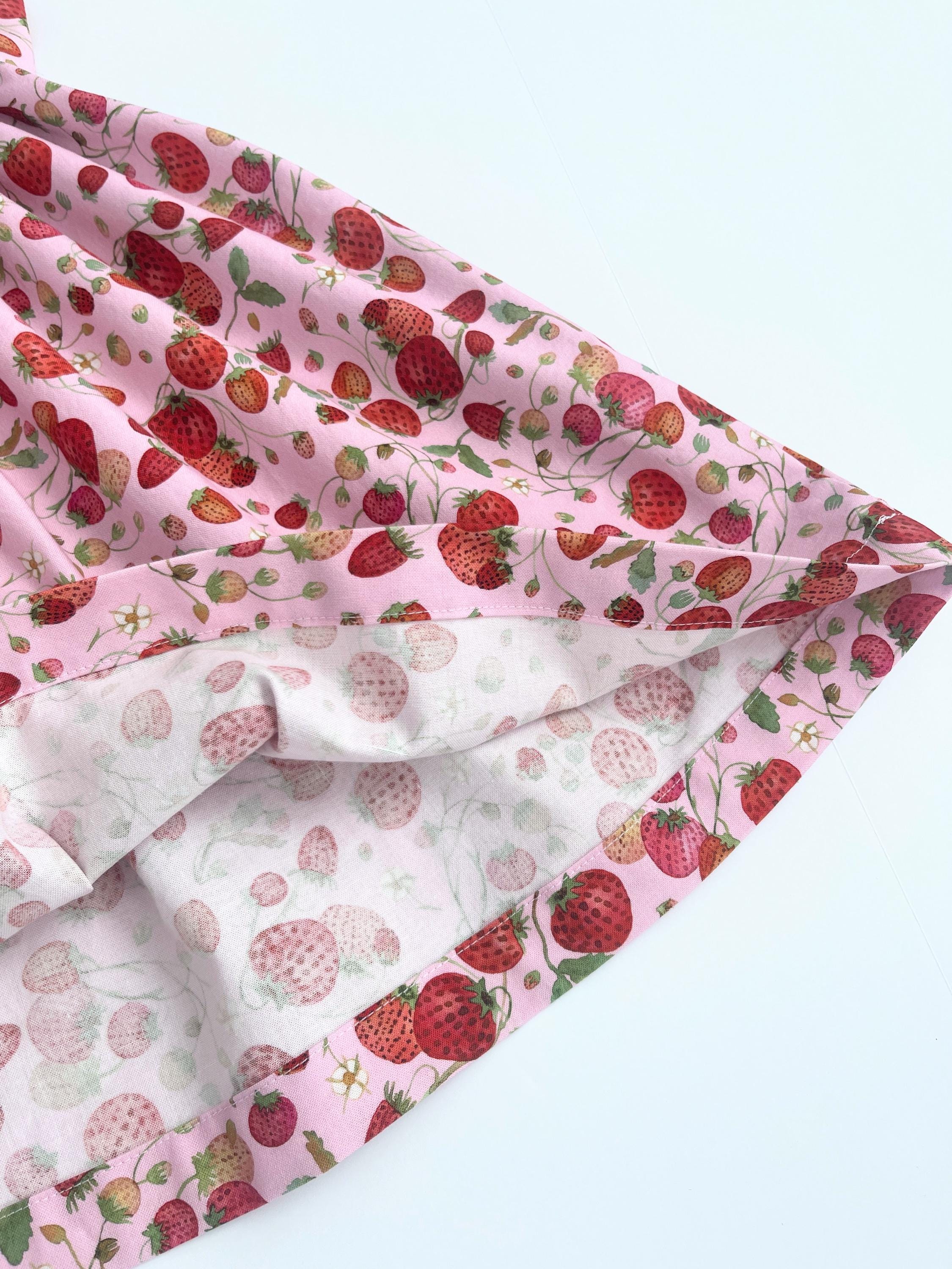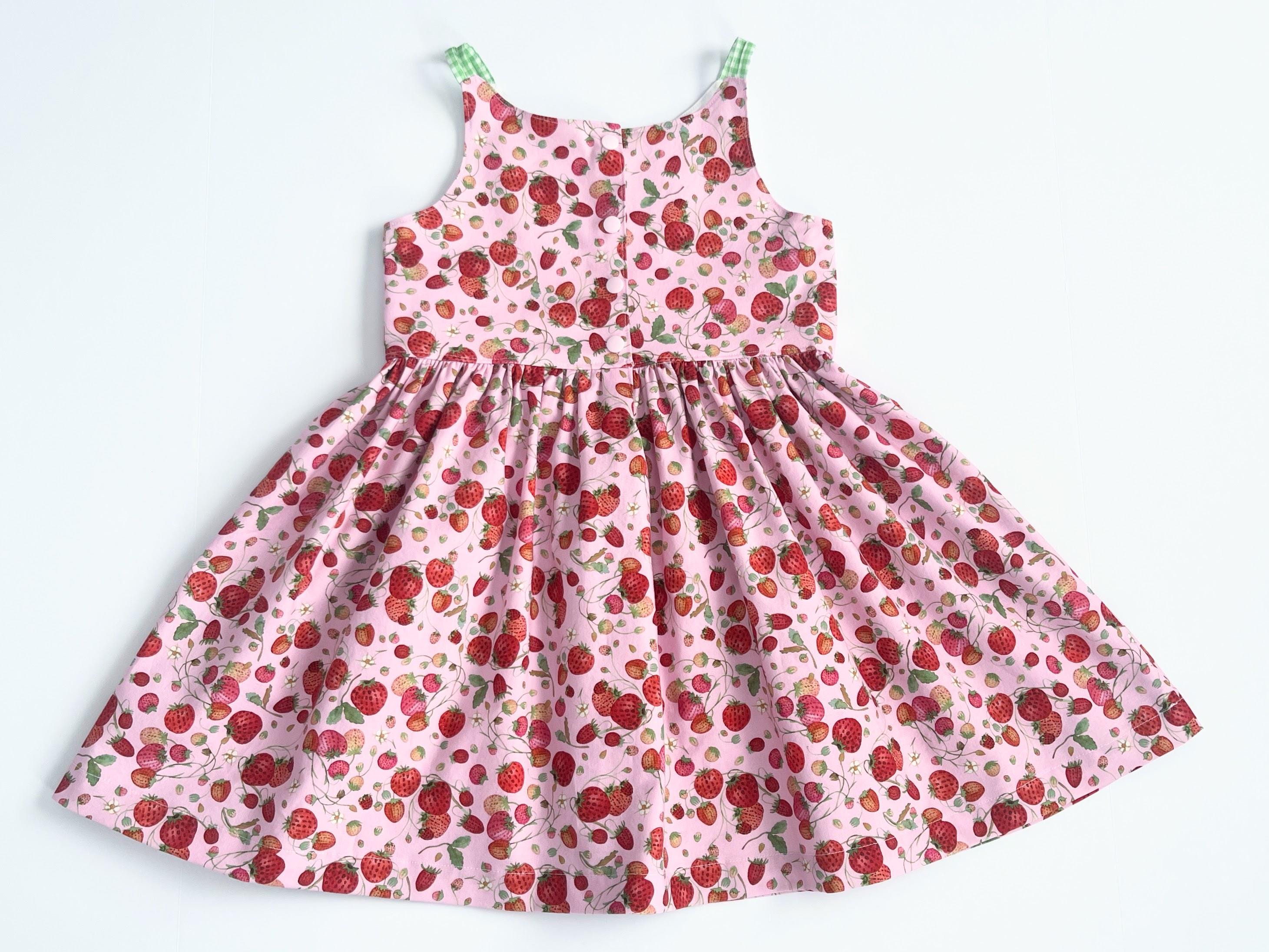 There is something so classic about a strawberry print for summer! This handmade girls dress features a vibrant all-over strawberry pattern on a soft pink background, making it perfect for berry picking, birthday parties, or just a sunny afternoon in the garden.