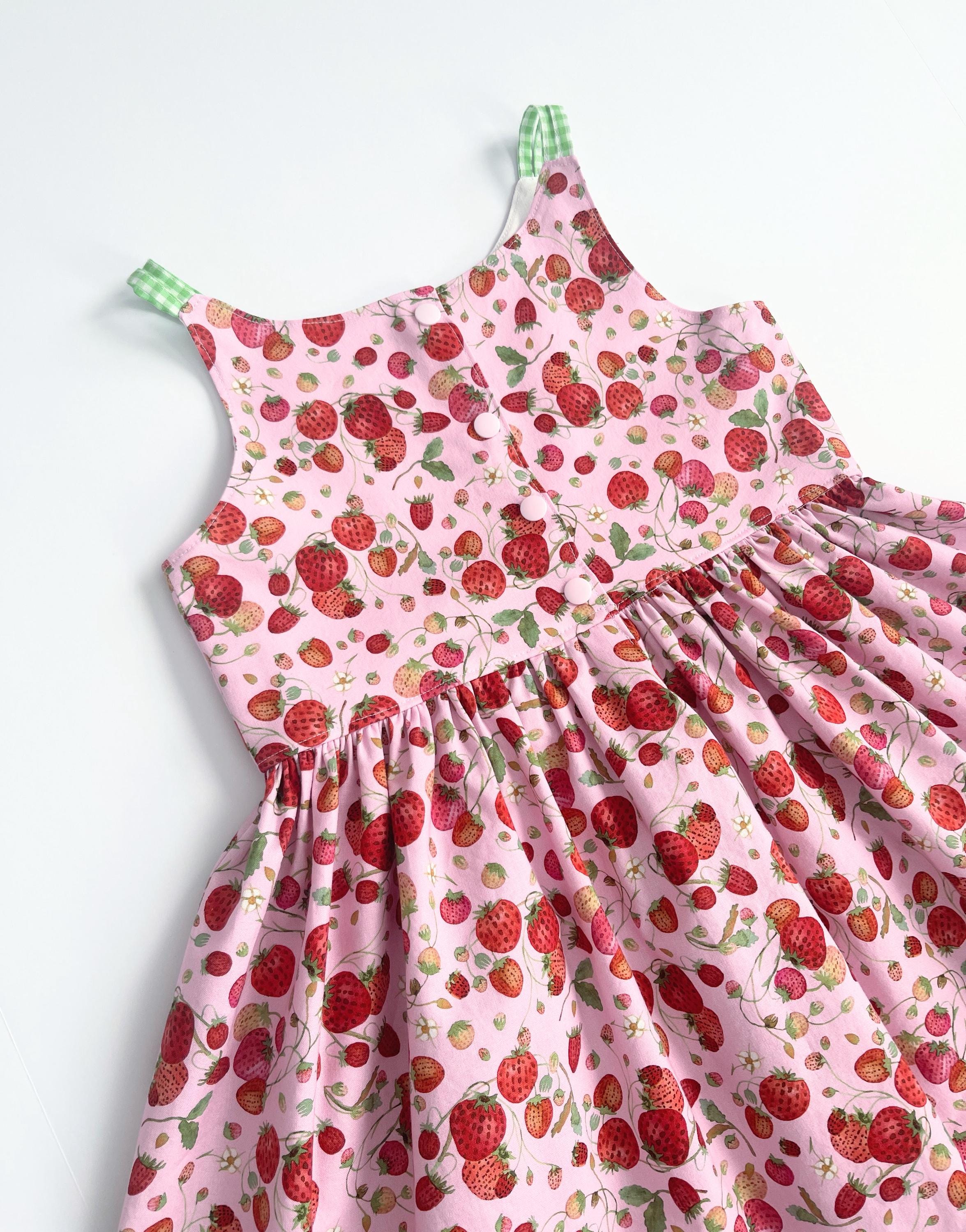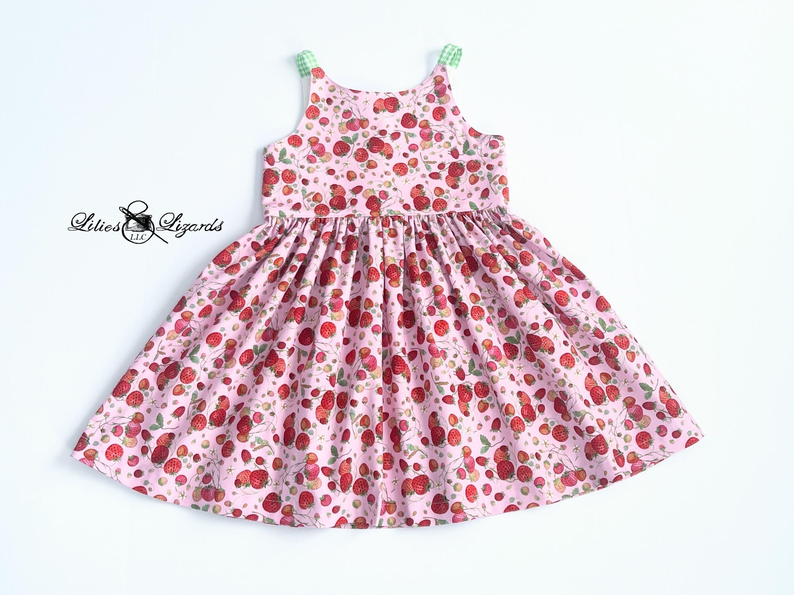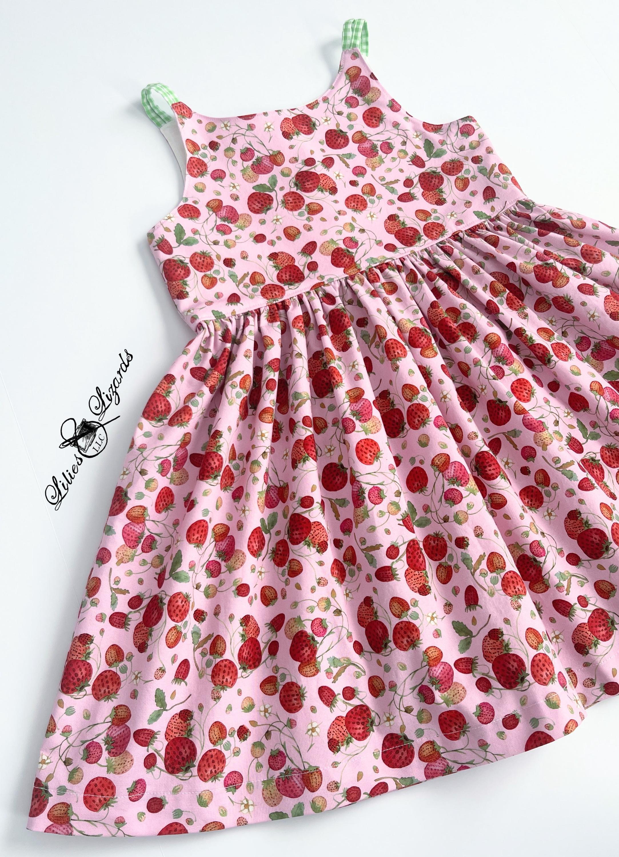 There is something so classic about a strawberry print for summer! This handmade girls dress features a vibrant all-over strawberry pattern on a soft pink background, making it perfect for berry picking, birthday parties, or just a sunny afternoon in the garden.