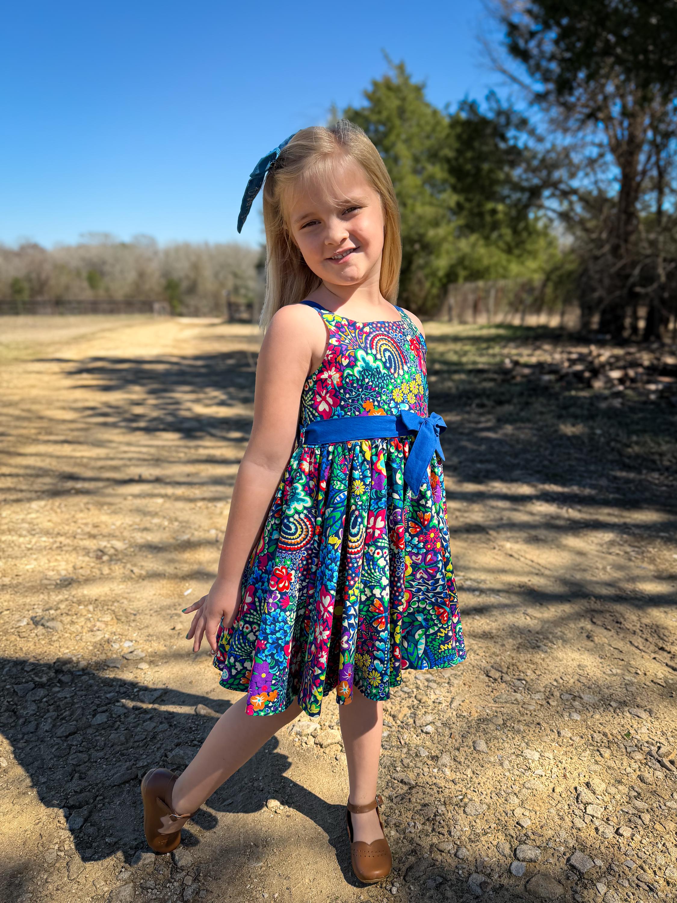 Designed for both style and play, the full, gathered circle skirt provides the ultimate "twirl factor" that little ones love. The removable blue belt ties into a beautiful statement bow at the waist, adding a touch of classic elegance to the bold, boho-inspired pattern. The belt can be tied in front, back, or to the side.