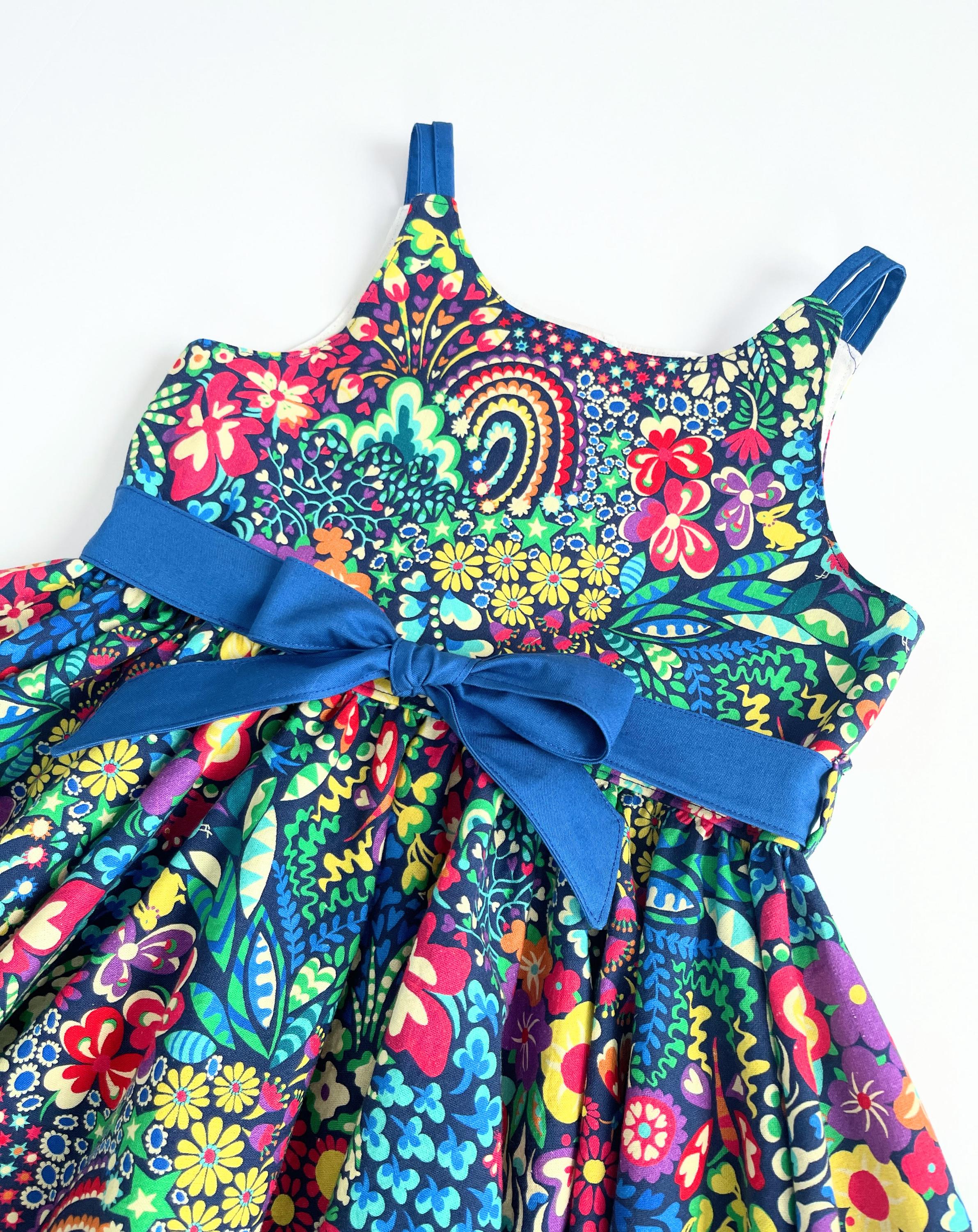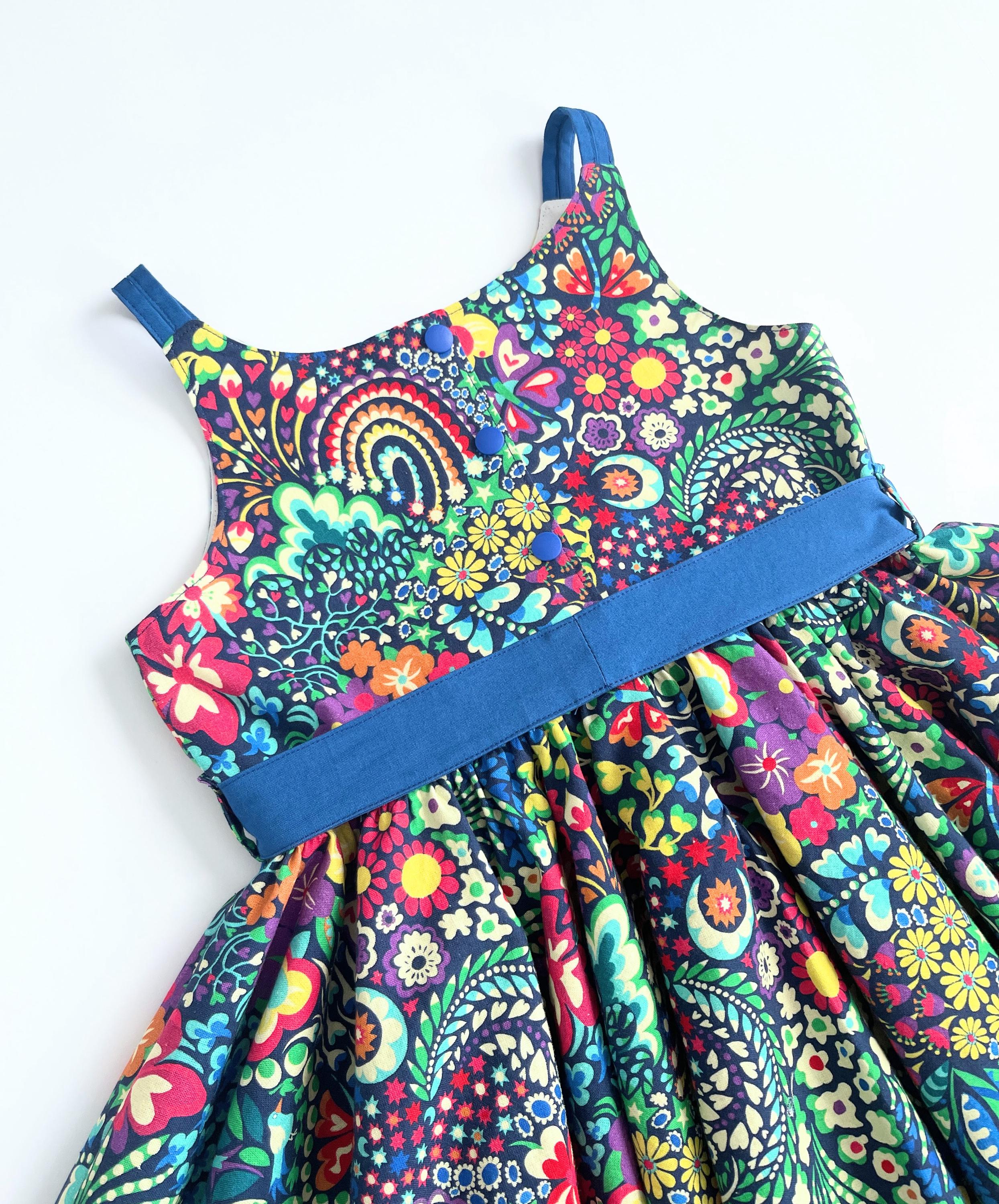 The straps and back bodice snaps match the blue belt, tying it all together in a dress perfect for parties and play.