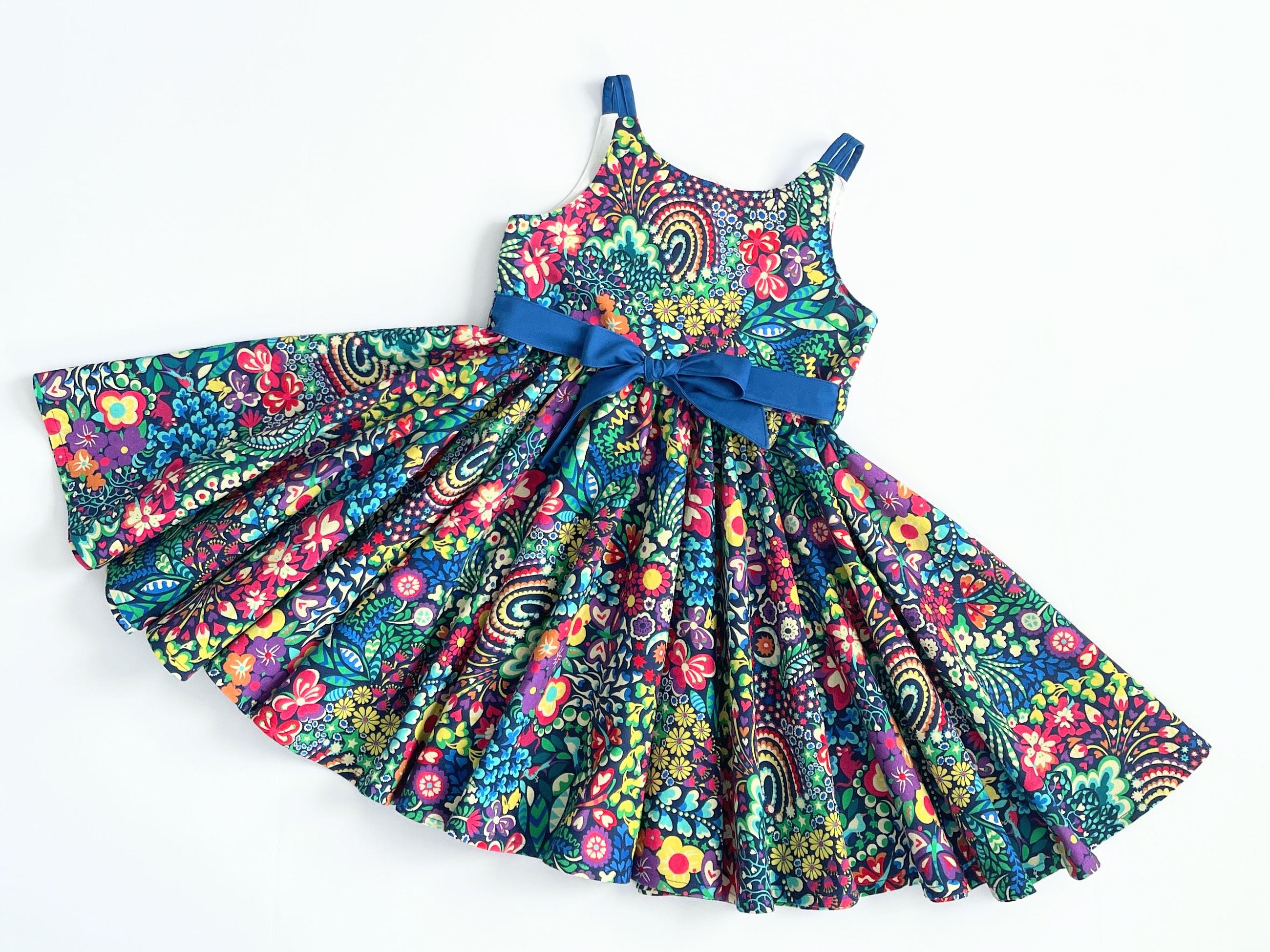Brighten up her wardrobe with this stunning handmade rainbow-floral summer dress from Lilies and Lizards LLC. This dress features a bright, all-over maximalist print overflowing with vibrant florals, whimsical paisley, rainbows, and little critters.