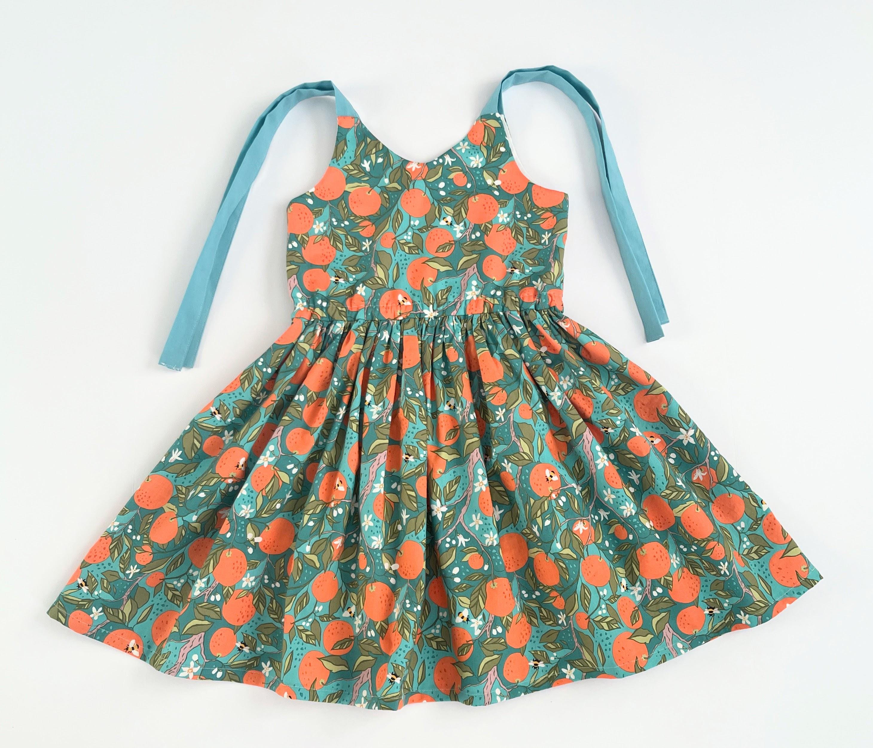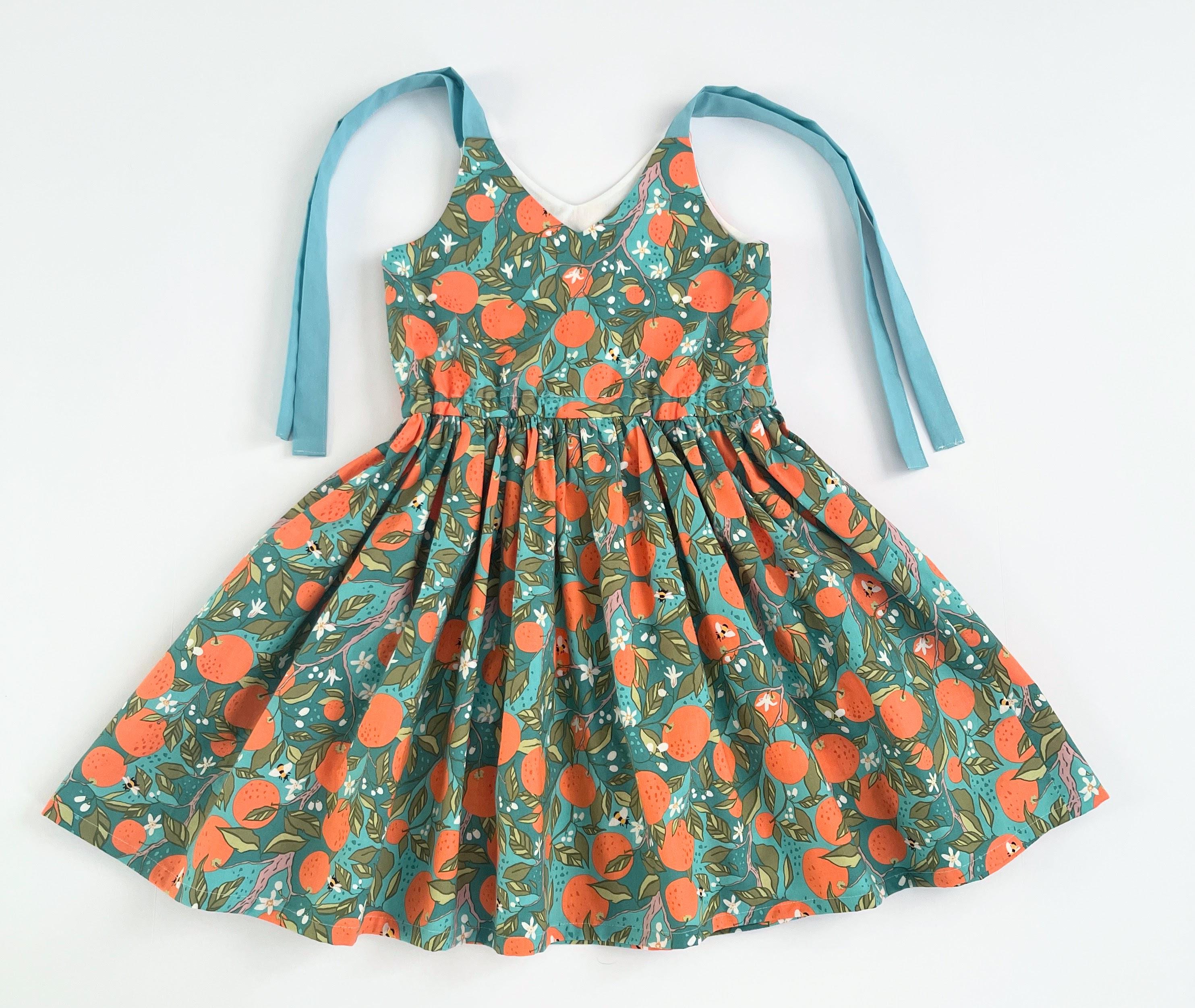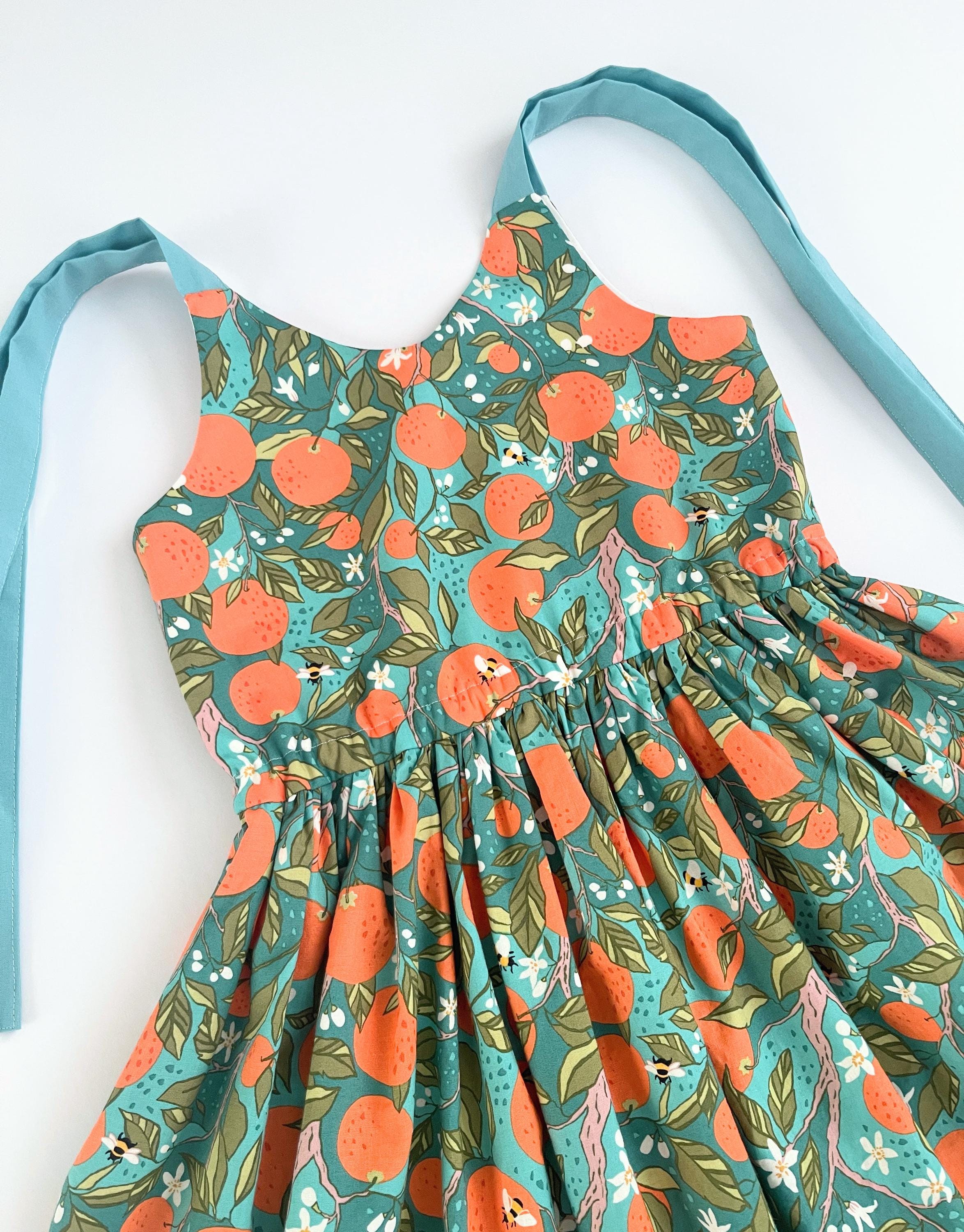 This handmade sundress features a vibrant, all-over citrus print with oranges, delicate blossoms, bees, and green leaves on a beautiful teal background.