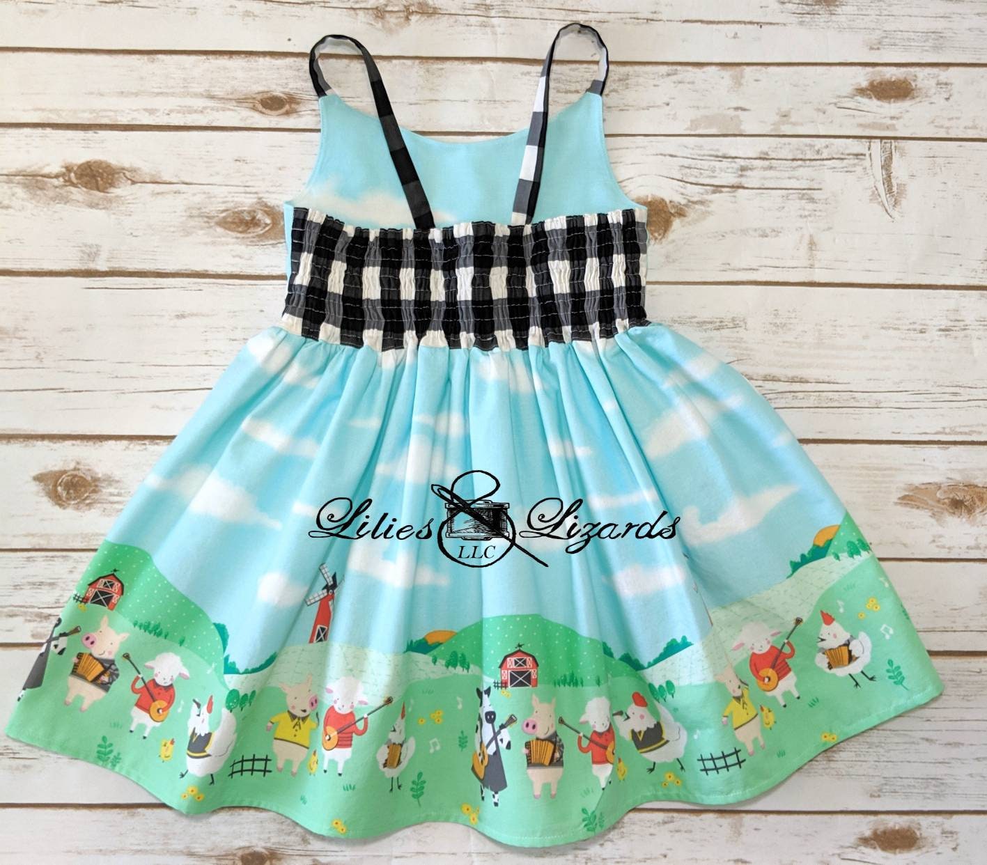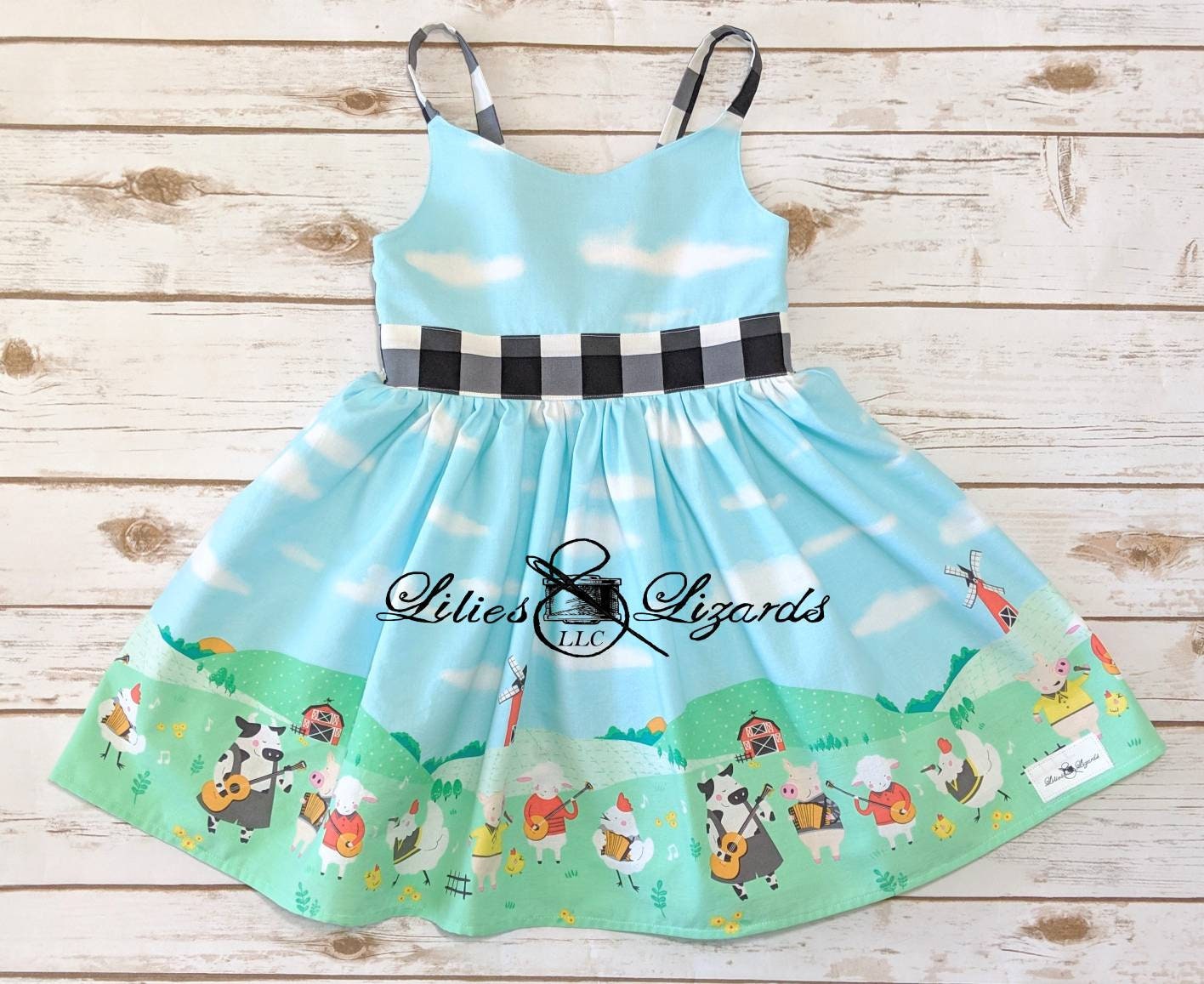 Watch her face light up with this sweet farm animal dress featuring an adorable parade of cows, pigs, and sheep playing guitars and instruments. This dress captures the magic of childhood imagination.